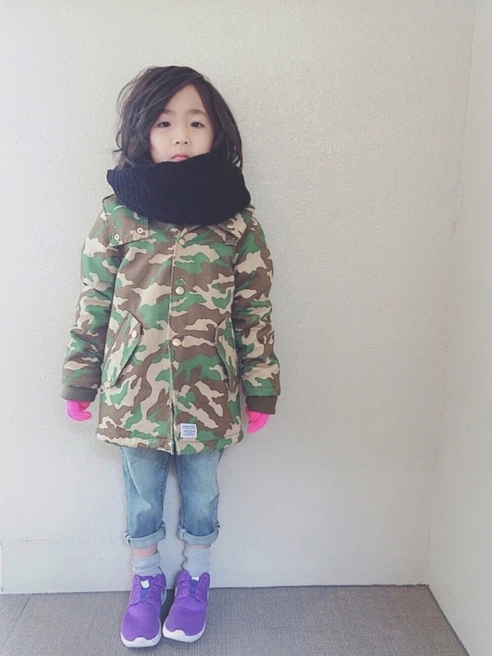まだまだ寒い💦 本日のリアルコーデ😬 カムチャットのデニムとGROOVYのアウターの相性の良さったら😭❤️ 自らパープルのスニーカーをチョイスしたのはええけど、勝手にピンクの手袋はめられてた😱💦 着たくもない服着せられた娘のささやかな抵抗…😑