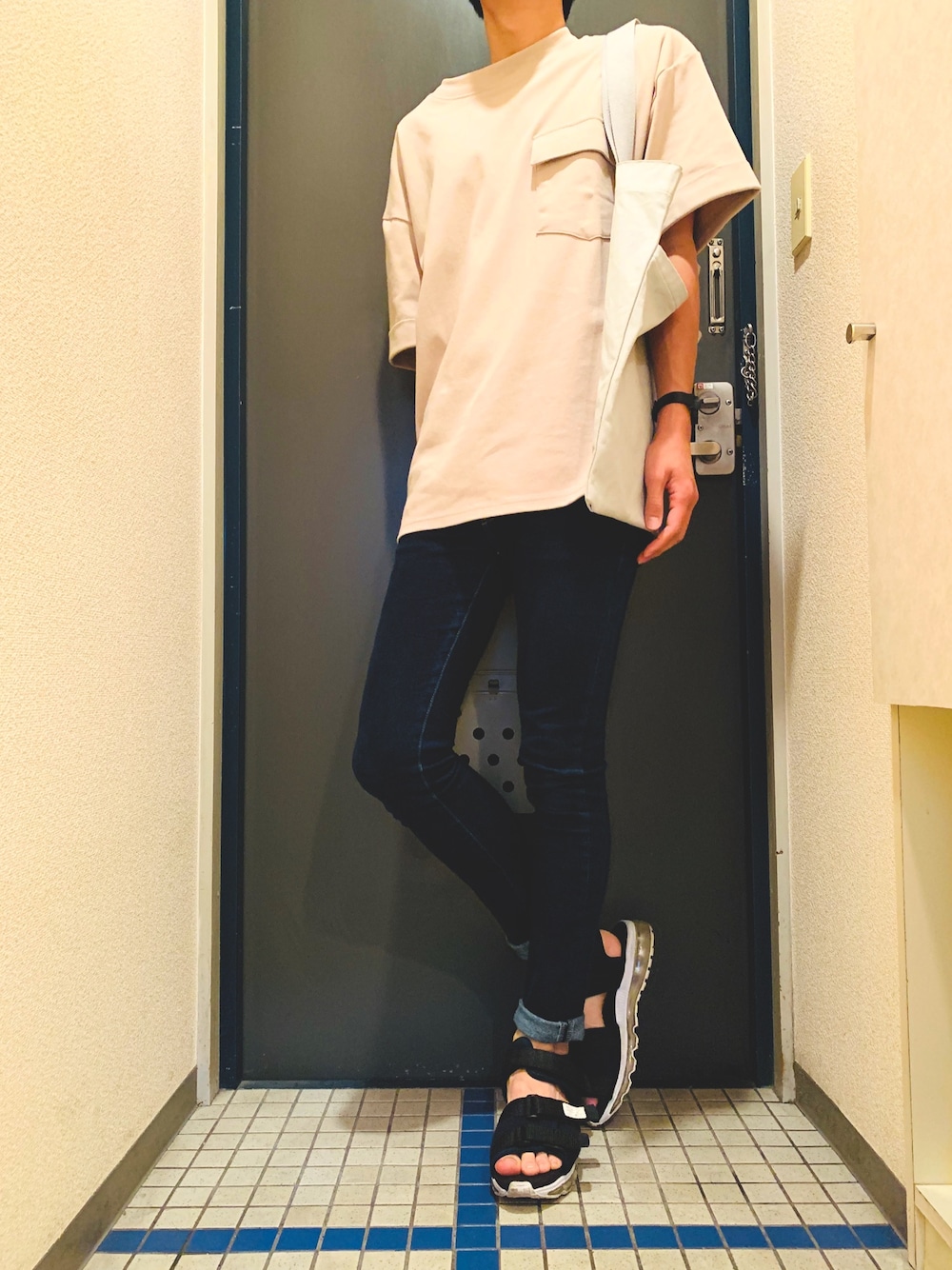 tシャツ×スキニーデニム いつもいいね、お気に入り 本当にありがとうございますm(__)m オーバーtシャツコーデ 久しぶりのトートバッグを使ってのコーデです オーバーtシャツとスキニーデニムで Vシルエットを意識しました! いつもより足が長く見えてくれると嬉しいな tops:M pants:1