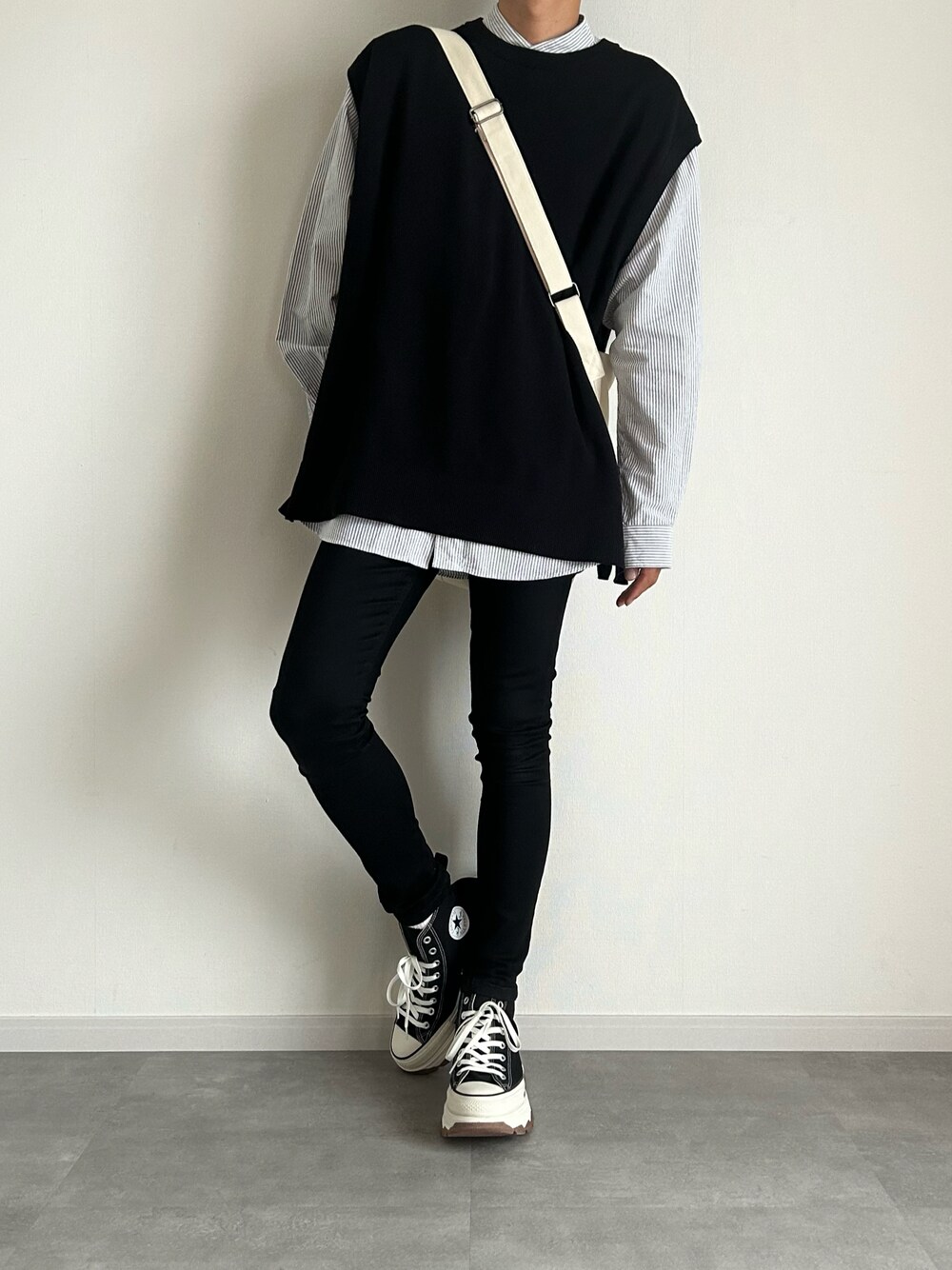 ニットベスト×シャツ×黒スキニー いつもいいね、お気に入り 本当にありがとうございます knit:XL shirt:L pants:S [Instagram] sorano_wear