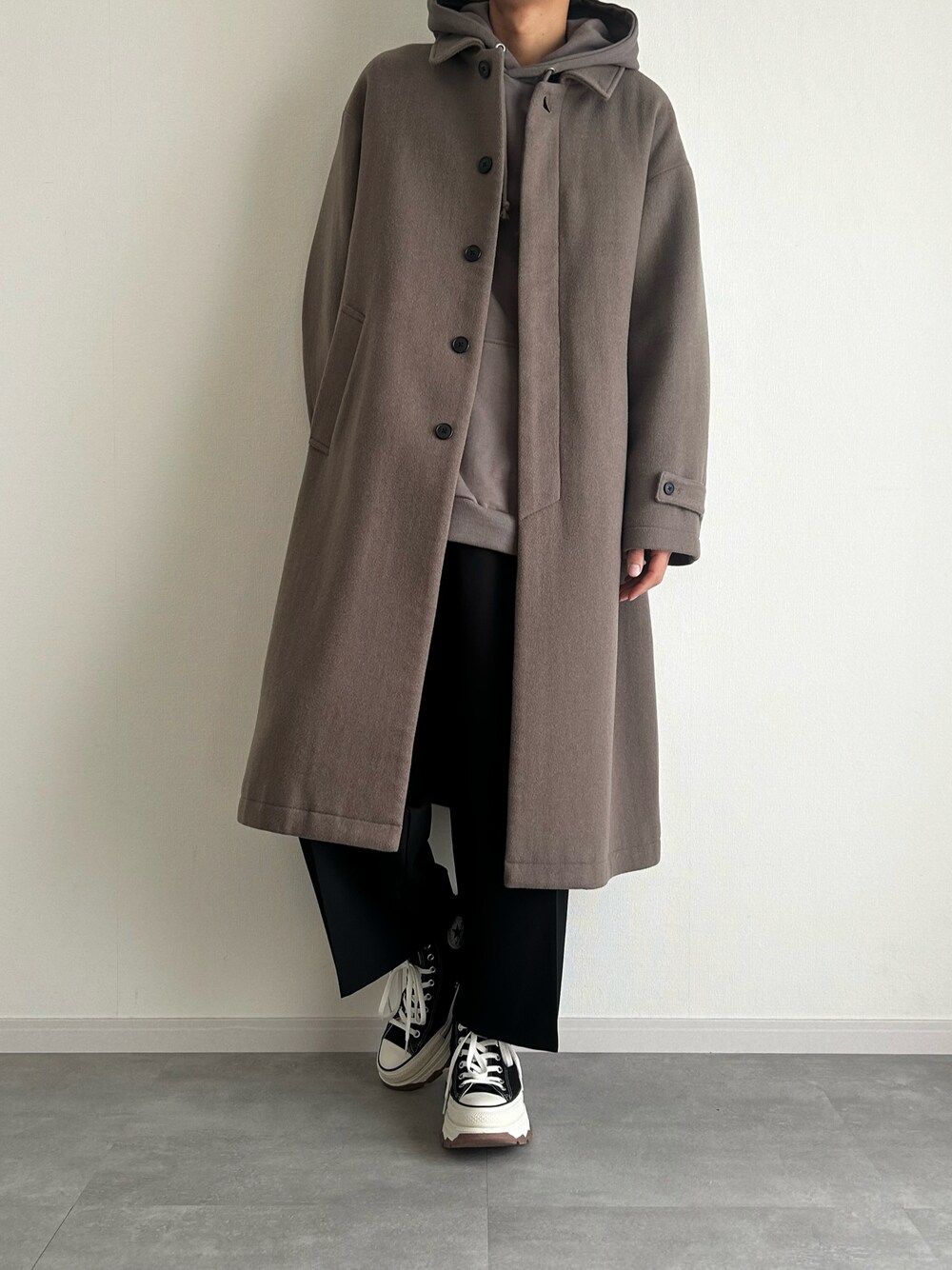 @soranoのステンカラーコート「ウールBIGステンカラーコート(HARE)」を使ったコーディネート