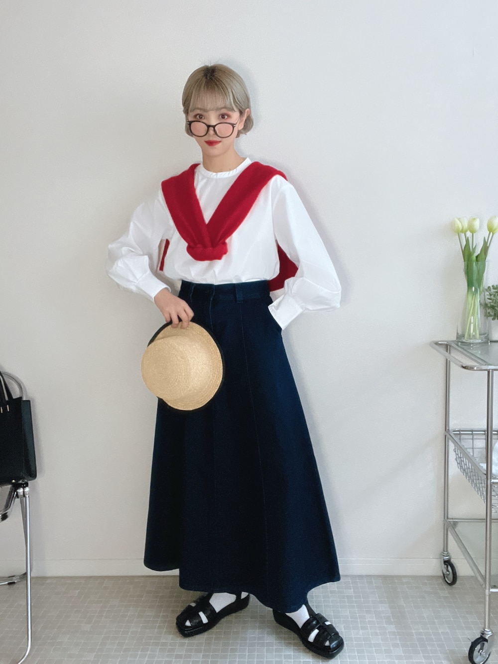 赤ニットがあると一気に雰囲気が変わる^ - ^ サンダルに靴下!春でも大活躍にしようと思ってる! スカートとシャツは最近MUJIの新作!