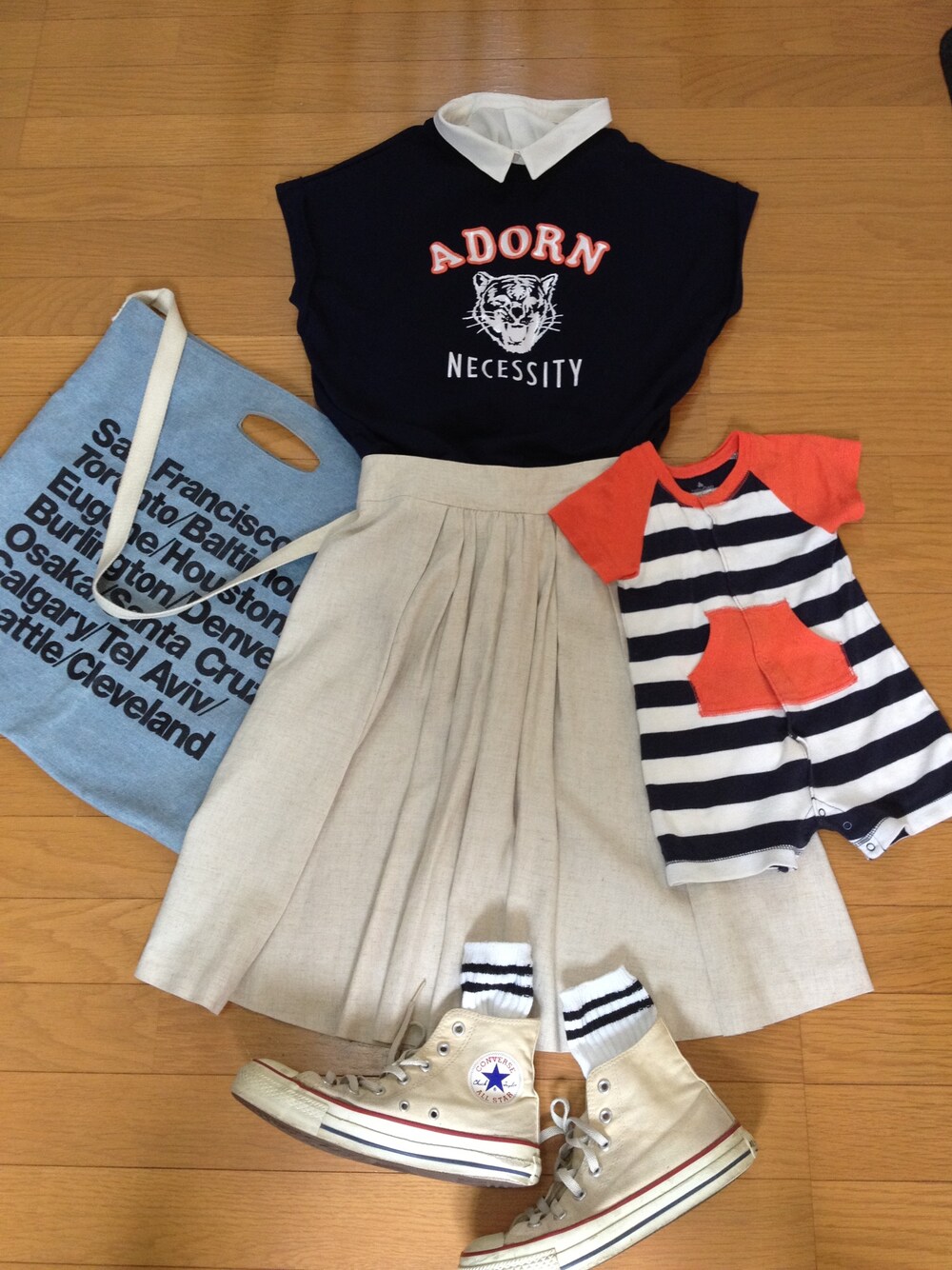 ネイビー地に縁取りがオレンジのロゴプルオーバーと、次男のネイビーボーダーにオレンジ配色のロンパースで、ちょっとだけペアルックにしてみました~(^人^) でも…実はまだこの虎プルオーバー…10%OFFにつられて買ったものの、なんだか私には若い気がして、まだ着れてません…ヽ(;▽;)ノ 誰か大人っぽい着こなしをアドバイスして下さい! よろしくお願いします(^-^)/ スカートはアクアガールのこれまたかなり昔に買ったもの…どれだけアクアガール好きなんだろう…(笑)
