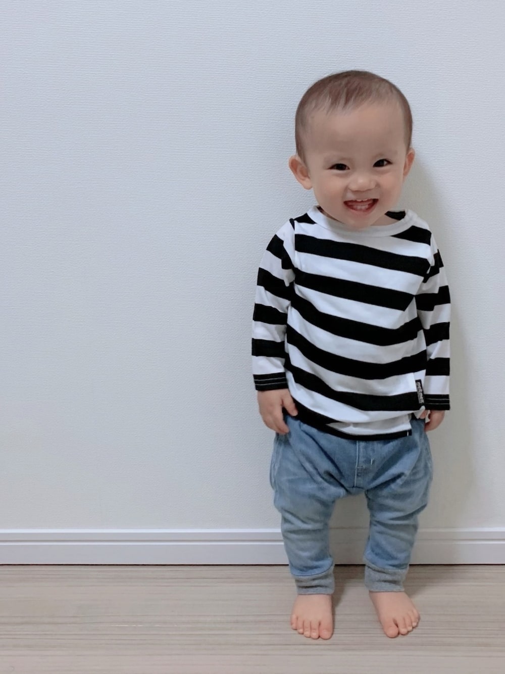 ご覧頂きありがとうございます🙂 弟コーデ 1y2m/70cm/9kg おうち撮りにしてみました。 帽子かぶらないと髪の毛薄めです。 meltのボーダーTシャツはデザインも良く、半額になっていたので購入しました!