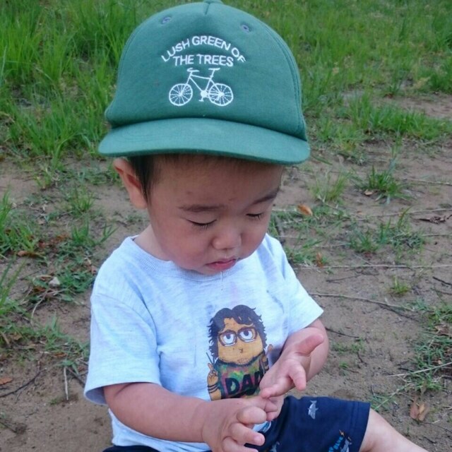 「futafutaのアイテム(キャップ、グリーン系)」を使った、SŌSHIさん(キッズ・80cm)の春コーディネート