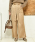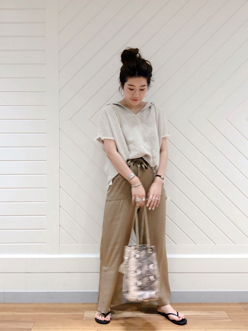 リネン×サテンの異素材コンビ パンツはリボンでウエストの 調整が可能です。