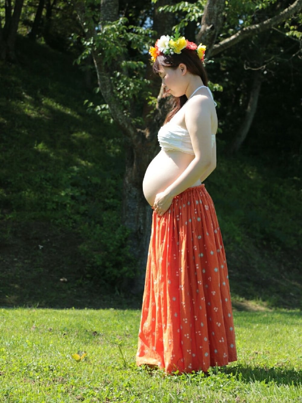 オレンジ系のスカートを着用したレディースの夏コーディネートの1枚目の写真