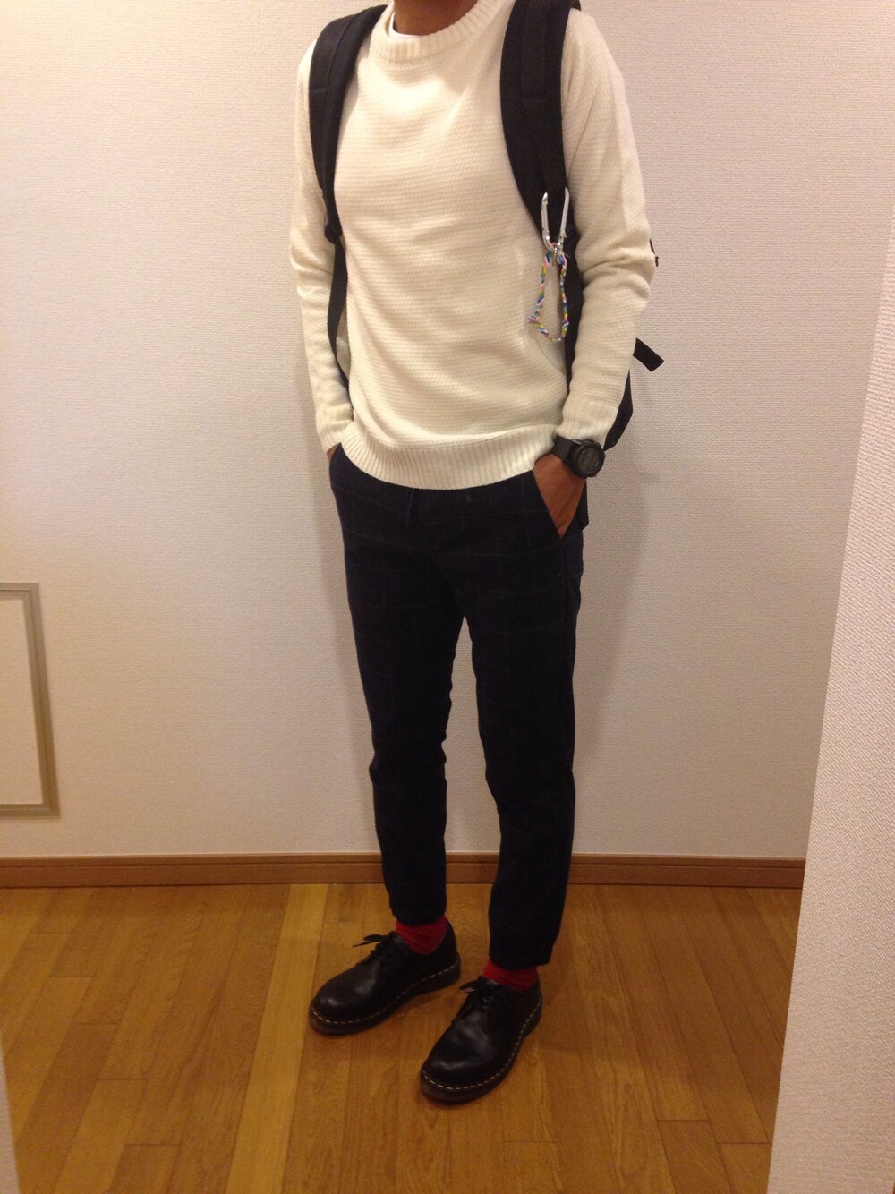 白ニットをメインにシンプルなコーデにしました😐 モノトーンの中に赤ソックスで挿してるつもりです…笑