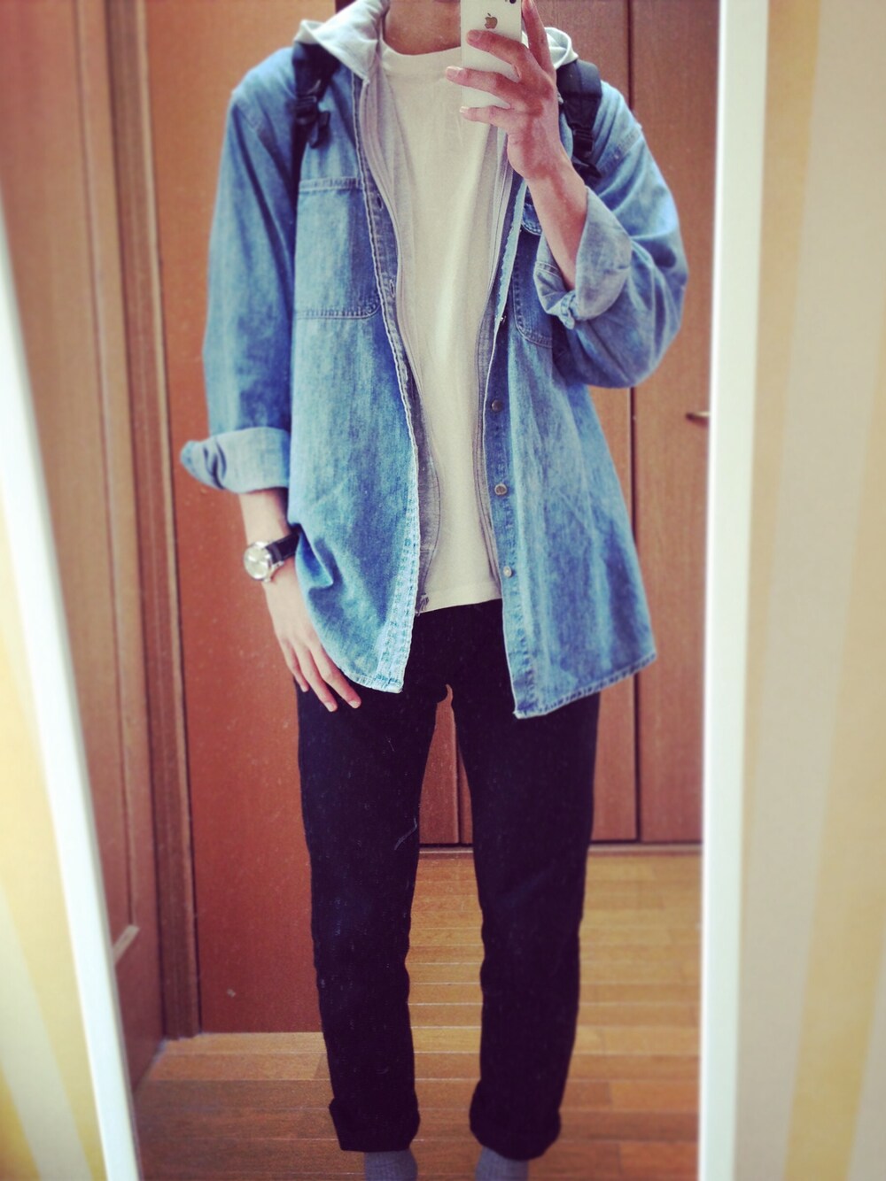 ブラック系のデニムパンツを着用したメンズの春コーディネートの1枚目の写真