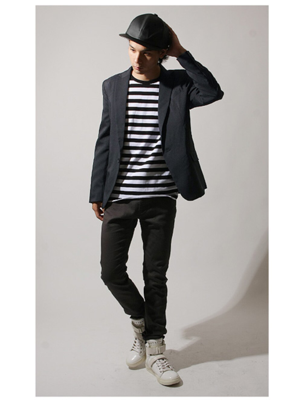 ジャケットをストリートMIXでコーディネート。 シンプルな白黒のモノトーンでなく、 ジャケットはネイビー、パンツはチャコールと色味を微妙に変えています。