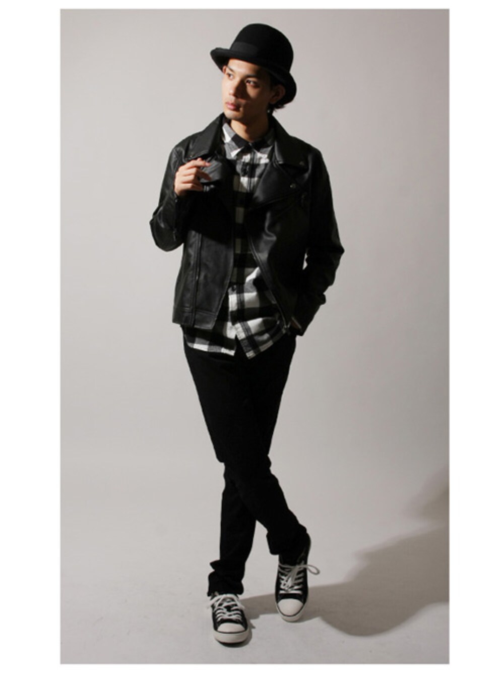 人気のチェックシャツをライダースジャケットでワイルドにコーデ。 パンツ、ハット、スニーカーと全身モノトーンでまとめてかわいくなり過ぎないように。