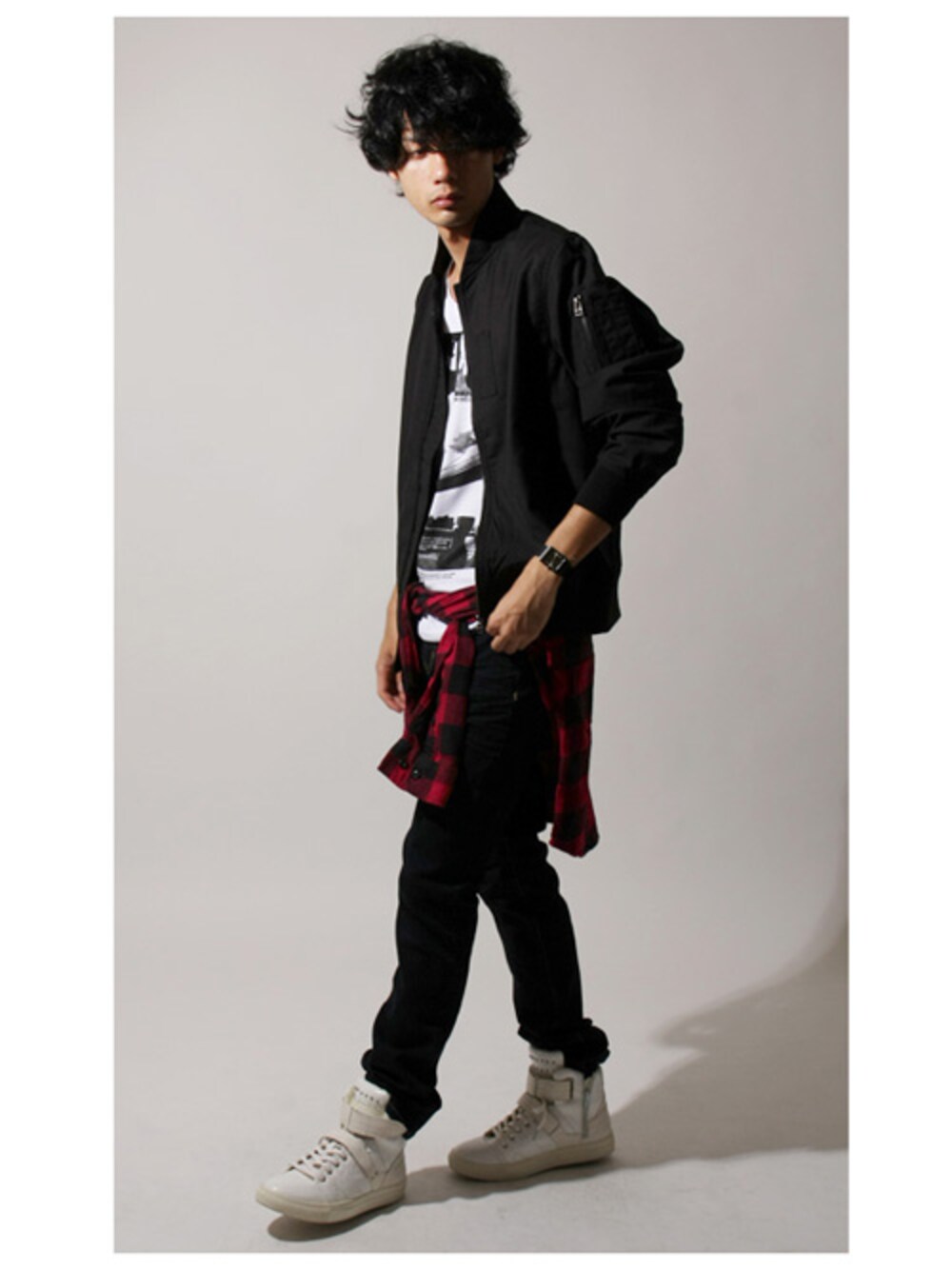 トレンドの腰巻きスタイルをストリートMIXでコーデ。 赤いブロックチェックシャツがアクセントに。