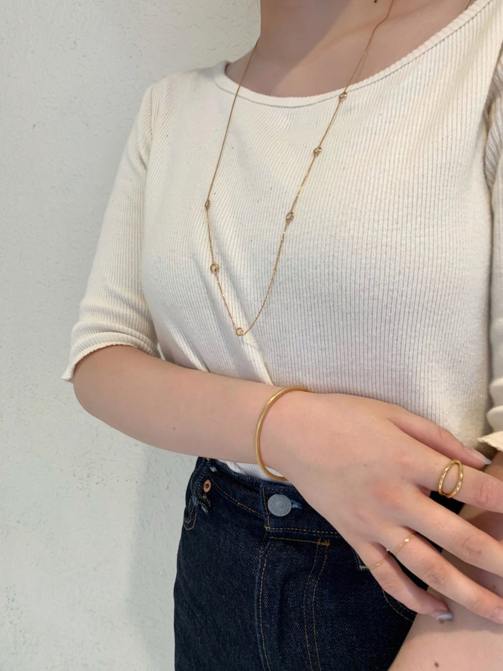 シンプルなトップスを着たので、クォーツのロングネックレスを合わせてみました。 長さが80cmあるので、厚手のニットの上からでも付けやすいです。 手元はマットな質感のバングルとシンプルながらも程よい存在感のあるリングを。