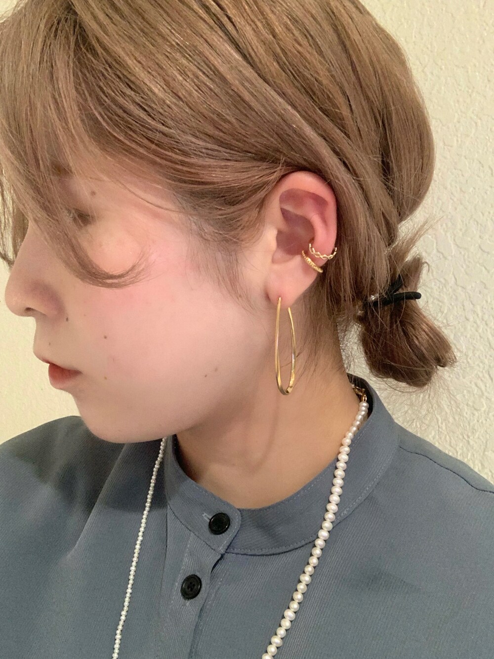 ピアスは表面がマットで内側が鏡面になっているので、立体感がでます。 ピアスが大きめなので、イヤカフは華奢なものを合わせました。 マリスのネックレスは80cm! パールが大小大きさが違うので、2連にしてつけても可愛いです。