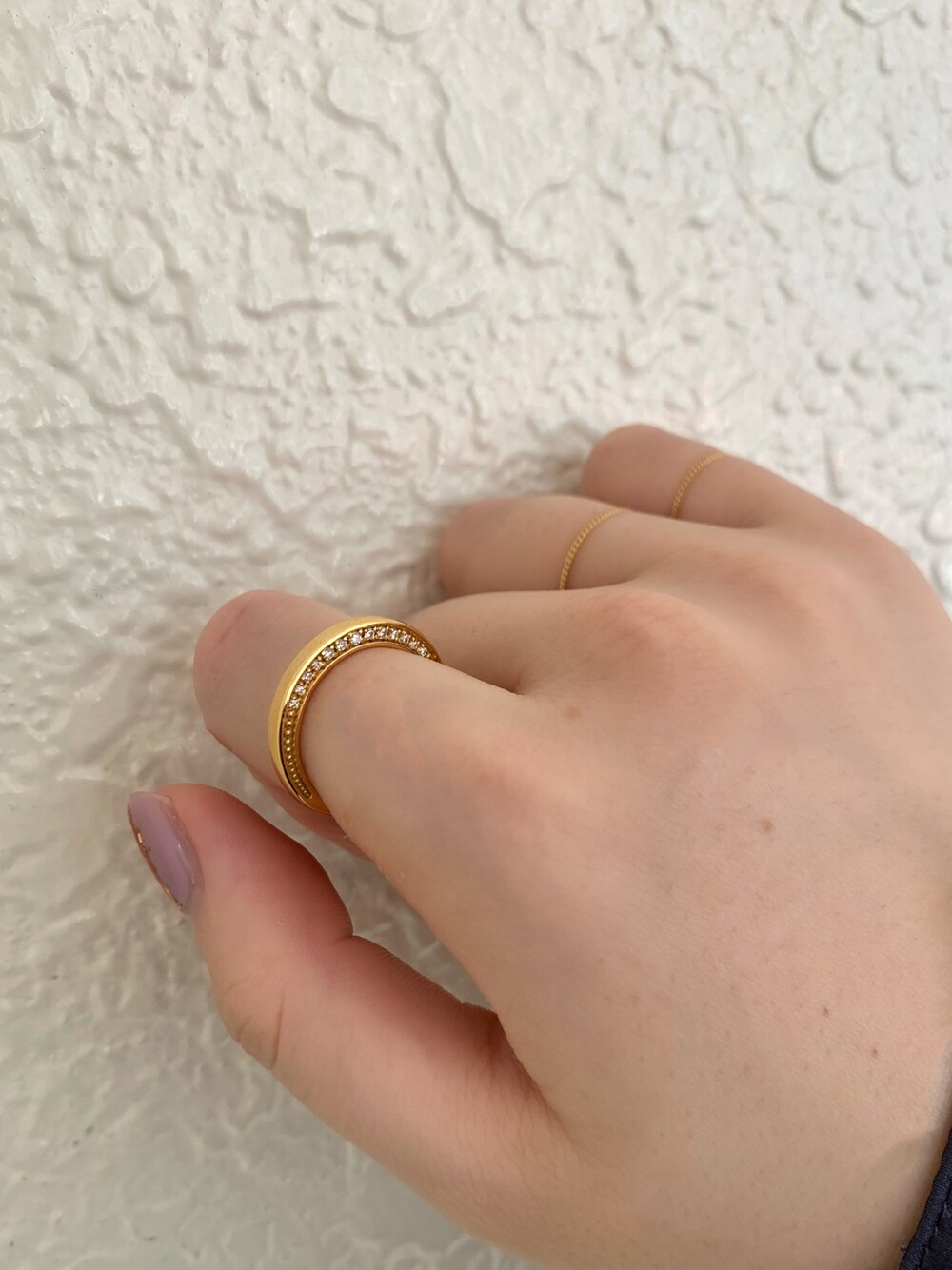 一見シンプルに見えて、側面のジルコニアのデザインがある可愛いリング☪︎ 側面でチラッと見せるのがオシャレです。 ムーンのリング存在感があるので、華奢なチェーンをリングと合わせました。