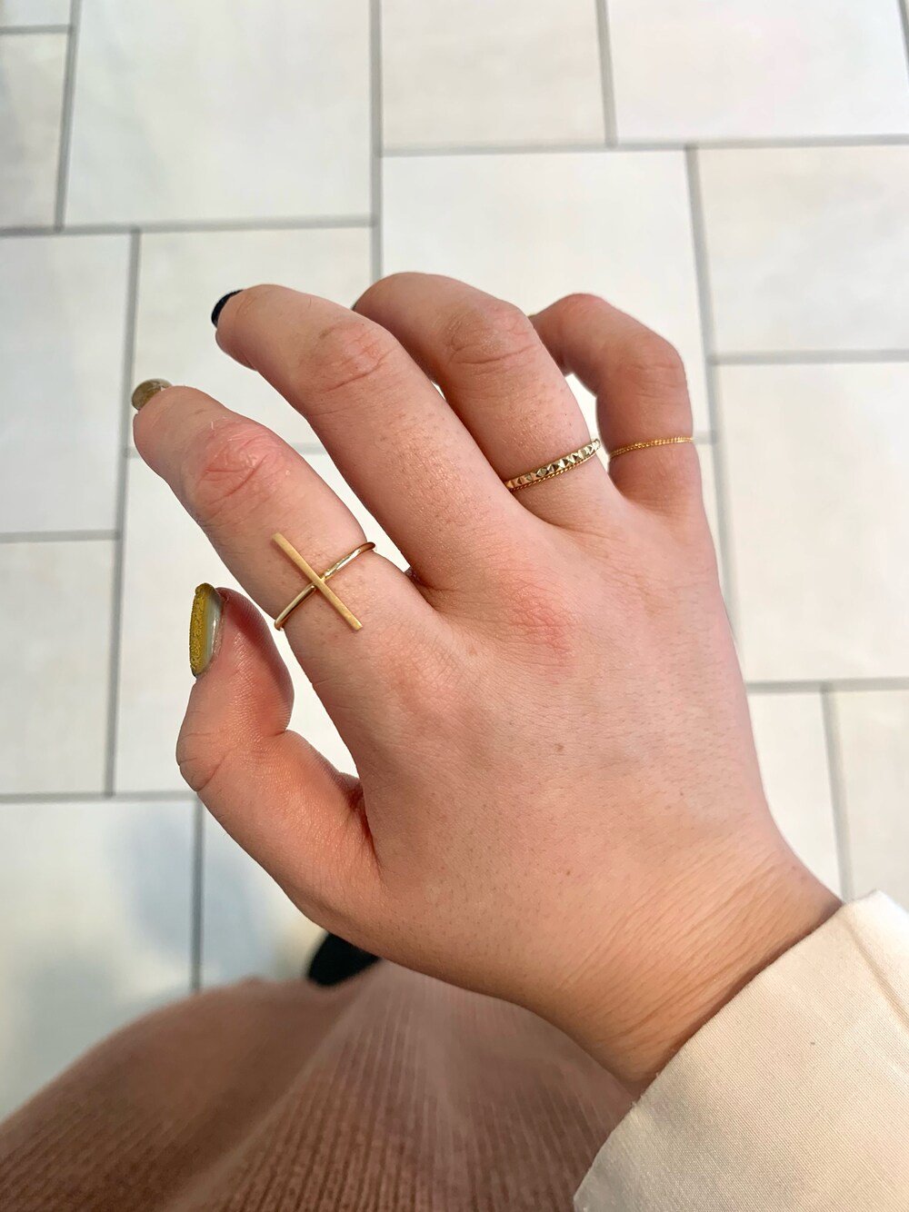新作のスタッズリングを使ったコーディネート! チェーンリングとの相性も良く、スタッズリングからキヘイチェーンリングがチラ見えするのが可愛い♡ 華奢ですが、スタッズリングとストレートリングでエッジの効いた手元になります◎