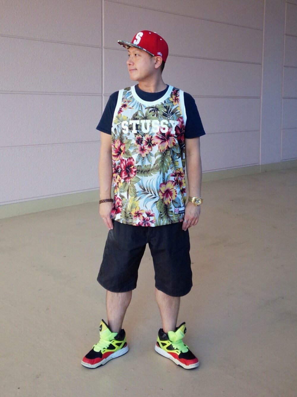 どうも!・・・夏バテ気味でアイスが主食になりつつあるポッシュですw 今日は黒をベースにして派手なカラーのアイテムを重ねたり加えたりしてこんなコーデになりました! おわり(^_^)/