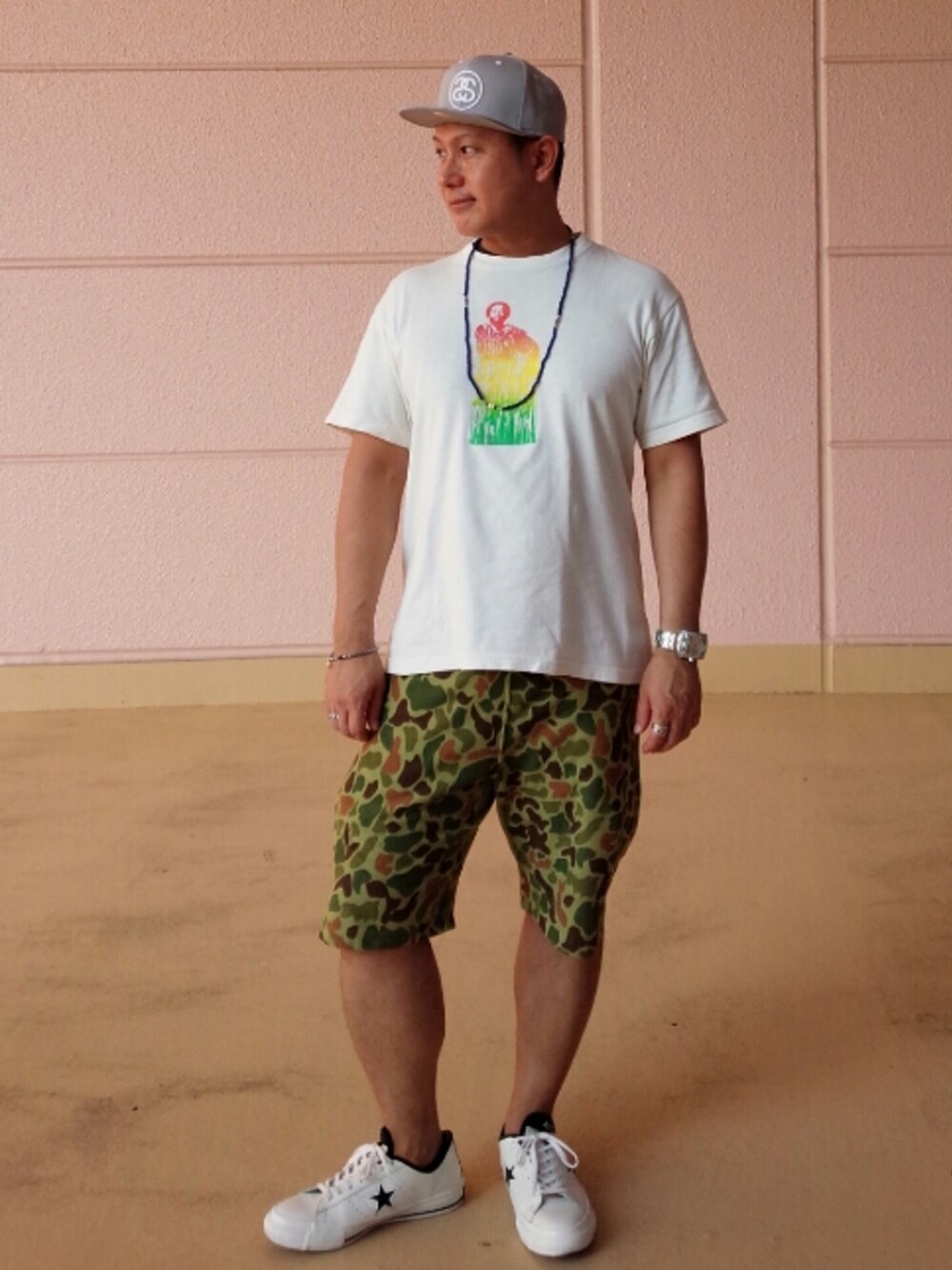 今日はstussyの古着のTシャツに今季物のショートパンツ アクセントに夏らしいブルーのビーズネックレスで合わせてみました(^O^)v 日焼けもして夏の準備も完了! おわり(^_^)/