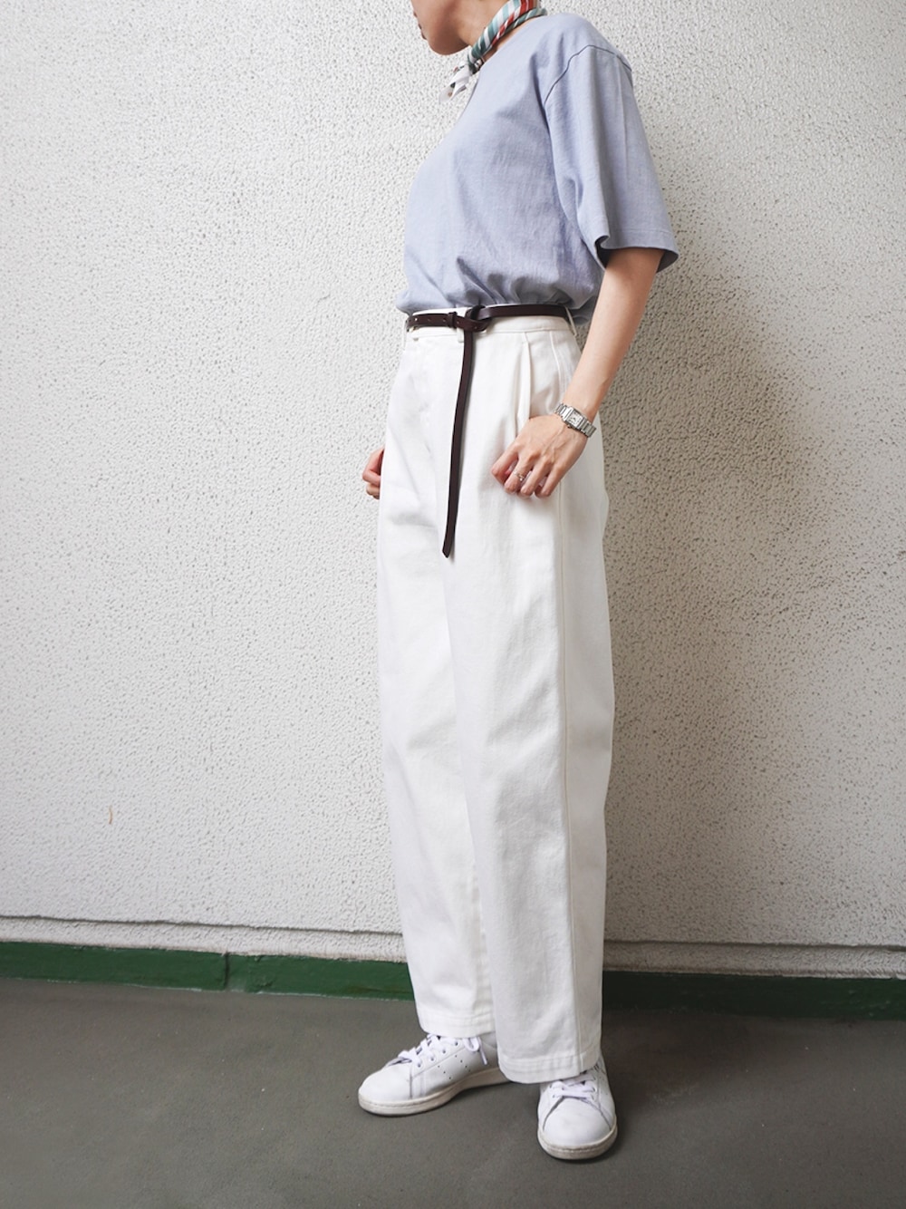 ブルーとホワイトが爽やかなコーデ。 tシャツはアメリカンシーアイランドコットンを使用した上質素材です。