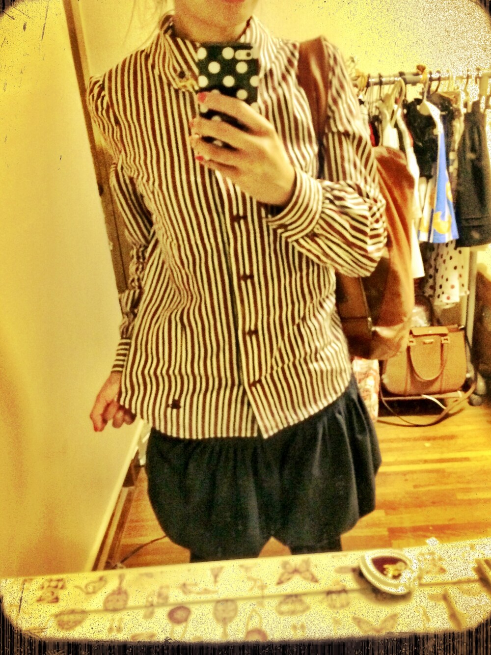 ストライプ シャツとバルーン型ショートパンツ