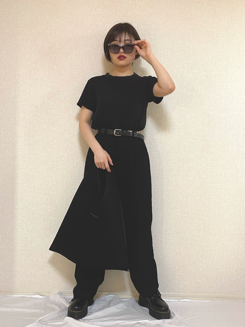 【無難だけどかっこいい黒コーデ】 黒が好きなので全身黒でまとめました! 着回しすぎなくらい着回しますAMERIのパンツ★ 前回のコーデのTシャツの色を変えました! 丈がかかとくらいまである緩めのパンツに、厚底のシューズを合わせると身長高見えにも、スタイルアップにもなります! 厚底の靴は歩きやすくて、遠出にも最適ですね!でも靴ずれすることもあるので、絆創膏持っていきます! 黒は日差しが強い日は暑いので、雨の降らない曇りの日にきるのがいいですね! でも私は晴れの日でも着ます。 UNIQLOのTシャツは、丈夫で、洗濯しても型崩れしないので、本当に優秀です! 綿素材は通気性がよくて夏の暑い日には、群れを解消してくれたりします!お肌にも優しいです! MM6のメッシュトートはこの季節にぴったりの素材感です!持ち手の部分に腕を通して、バッグの底を持つとクラッチバッグぽく持つこともできて意外と印象違って可愛いです! 真っ黒シンプルだけど決まるコーディネートでした✴︎✴︎✴︎
