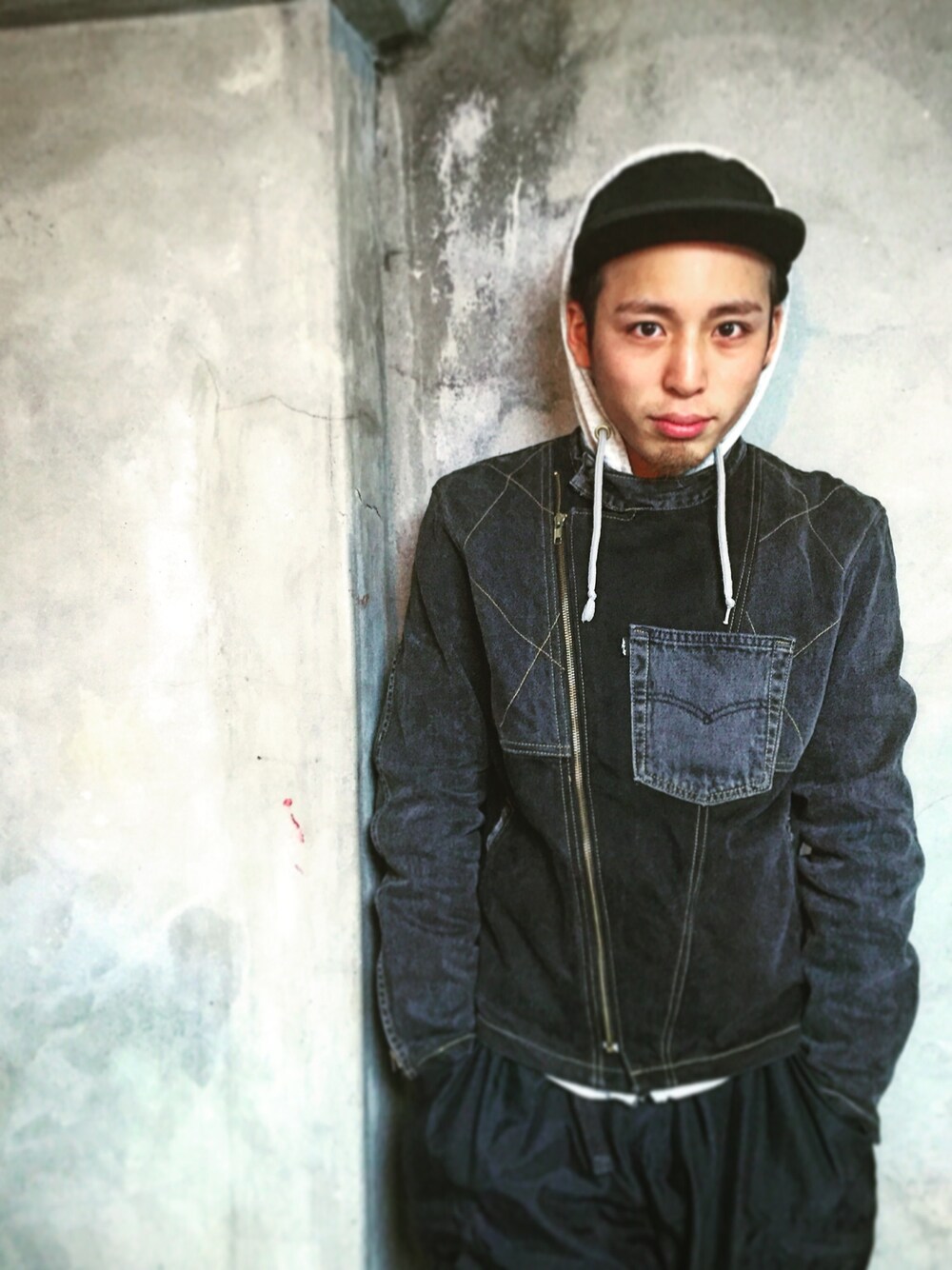 ブラック系のカーゴパンツ、ブラック系のデニムジャケット、ブラック系のキャップを着用したメンズの冬コーディネートの1枚目の写真