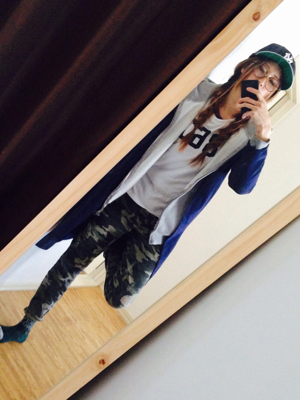 息子氏とキャップおそろコーデ♪ ネイビーのコート:グレイル パーカー:楽天 白T:楽天 カモフラパンツ:フリマ ソックス:GUメンズ キャップ:NEWERA 息子氏とおそろコーデくんだらこーなった。