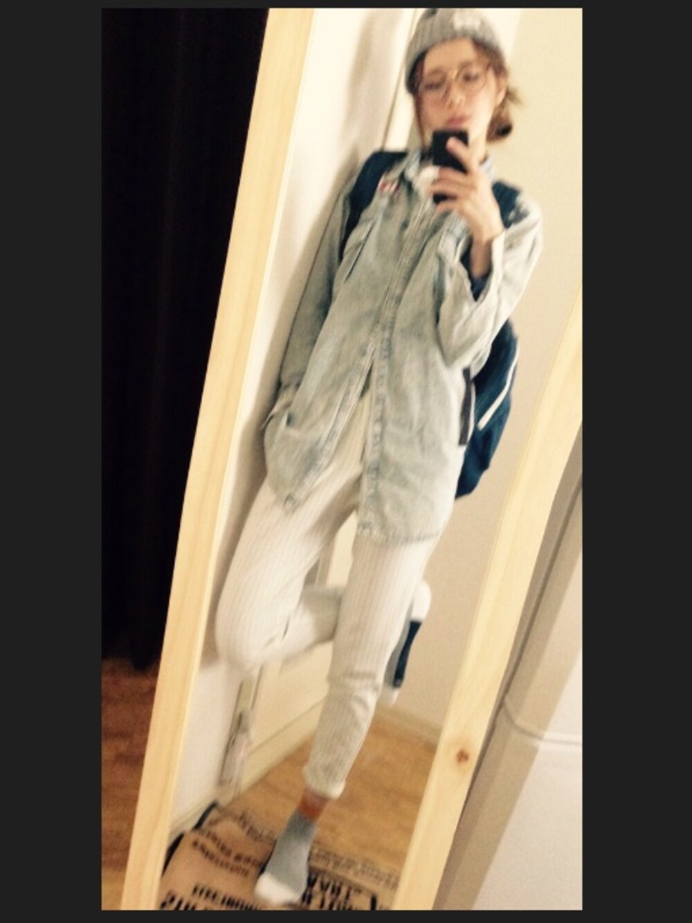 ニット帽:楽天 デニムシャツ:ungrid ストライプテーパードパンツ:gu ソックス:guメンズ バックパック:フリマ コーデ組みの途中に撮ったやつ。 シャツのボタンがっつしあいてるやん(笑) 寝起きあるある