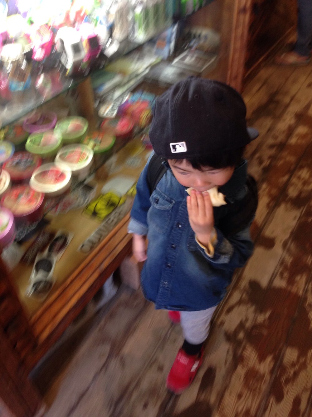 USA SURFにて 肉まんを頬張る息子 にだけピントが合った奇跡の一枚。 デニムシャツにスウェットに バックパック。 〆のNEWERA。 海沿いは風強くて寒そうやから ちょっとヒートテックパンツ チラ見せ。