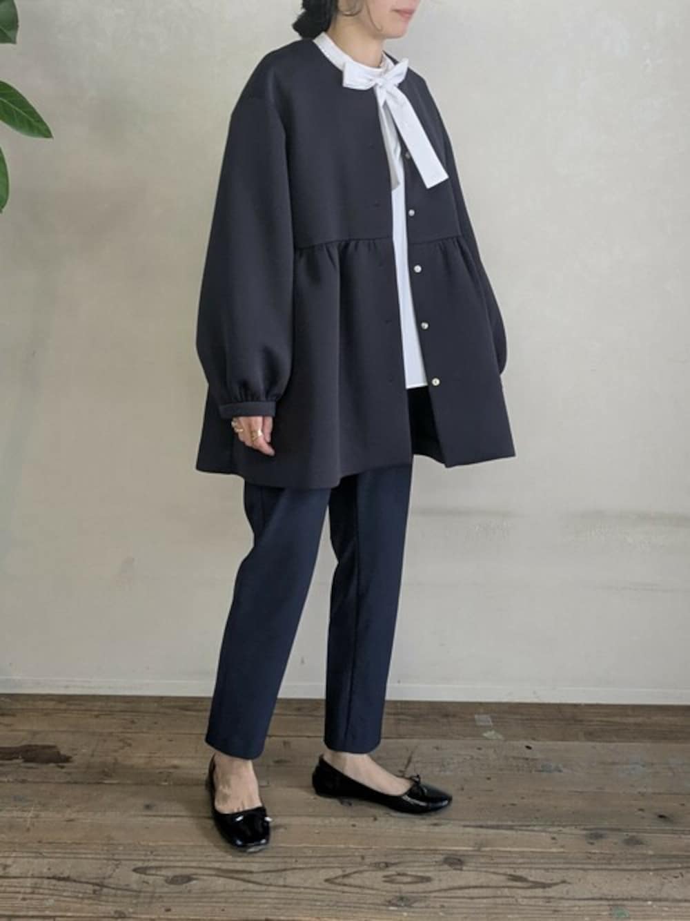 上品で洗練された卒園式コーディネート。SONOの定番人気アイテム、柔らかく軽やかなマシュマロ生地のノーカラーコートが、きれいめスタイルを演出します。インナーのホワイトブラウスと比較的のブラックパンツでシンプルにまとめ、フォーマル感をアップ。足元は光沢のあるローファーで上品さをプラスし、グレーのハンドバッグが全体を引き締める大人の洗練スタイルです
