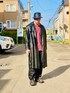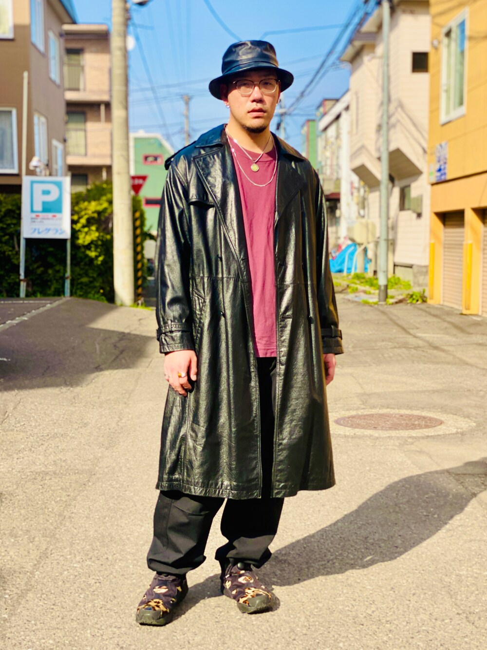 古着のレザーコートを使った黒コーデ。