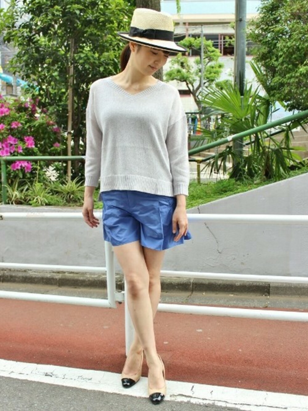 スカート感覚で履ける、タック使いがポイントのショートパンツのスタイリング。 シンプルなニットに合わせてシルエットを引き立たせています。