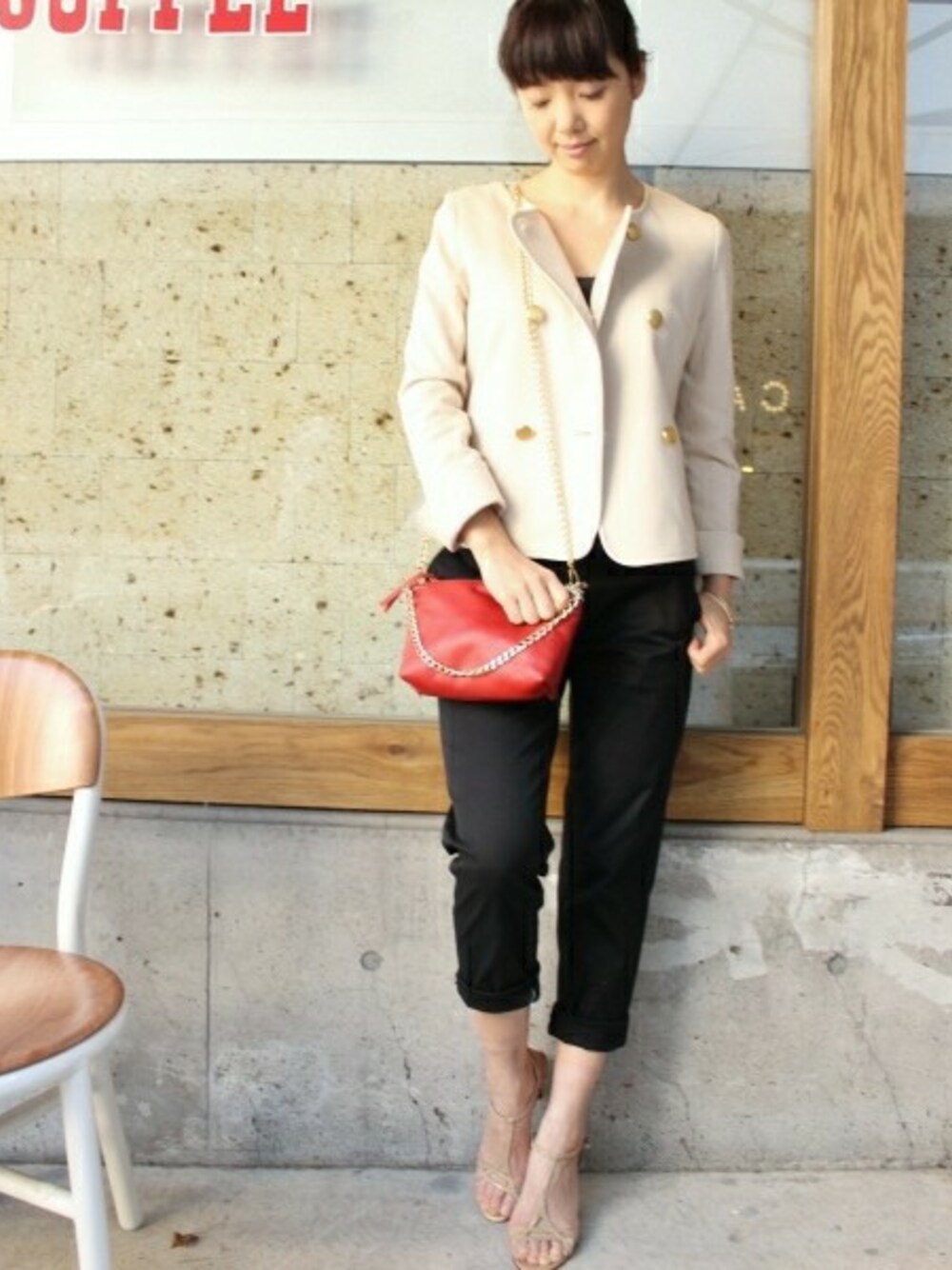 マリンテイストのノーカラージャケットをラフに羽織ってこなれた印象に。 GOODSのゴールド使いがアクセントになり、洗練されたパンツスタイルの完成です。
