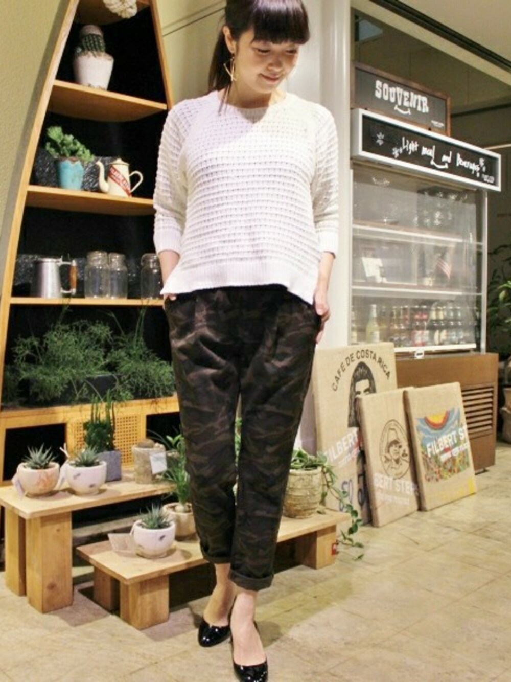 人気のミリタリー柄のイージーパンツに、真っ白なざっくりニットが映えるメリハリの効いたコーディネート。 足元はあえてパンプスで女らしさもプラスして。