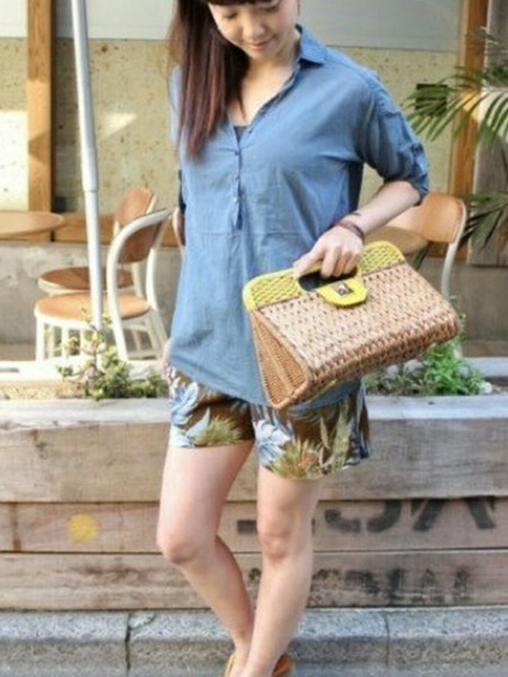 リゾートにもピッタリ。 ライムイエローのカゴ型クラッチは大人カジュアルな着こなしにおすすめ。