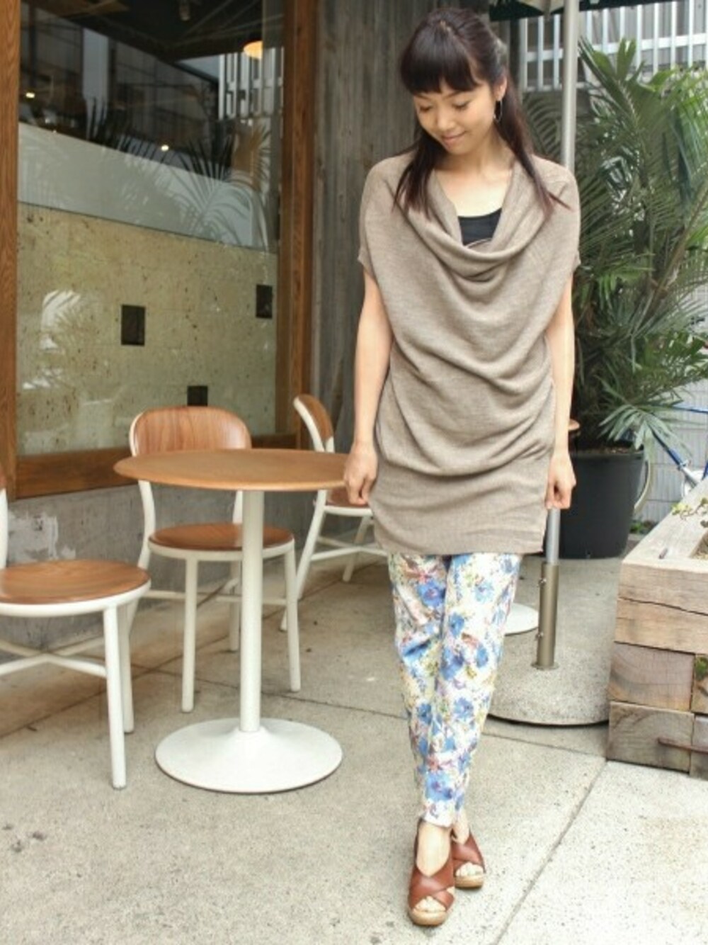 人気のフラワープリントスキーパンツにBIGサイズニットを合わせました! 敢えてカラーは控えめにして、パンツがポイントになるようなスタイリングです。