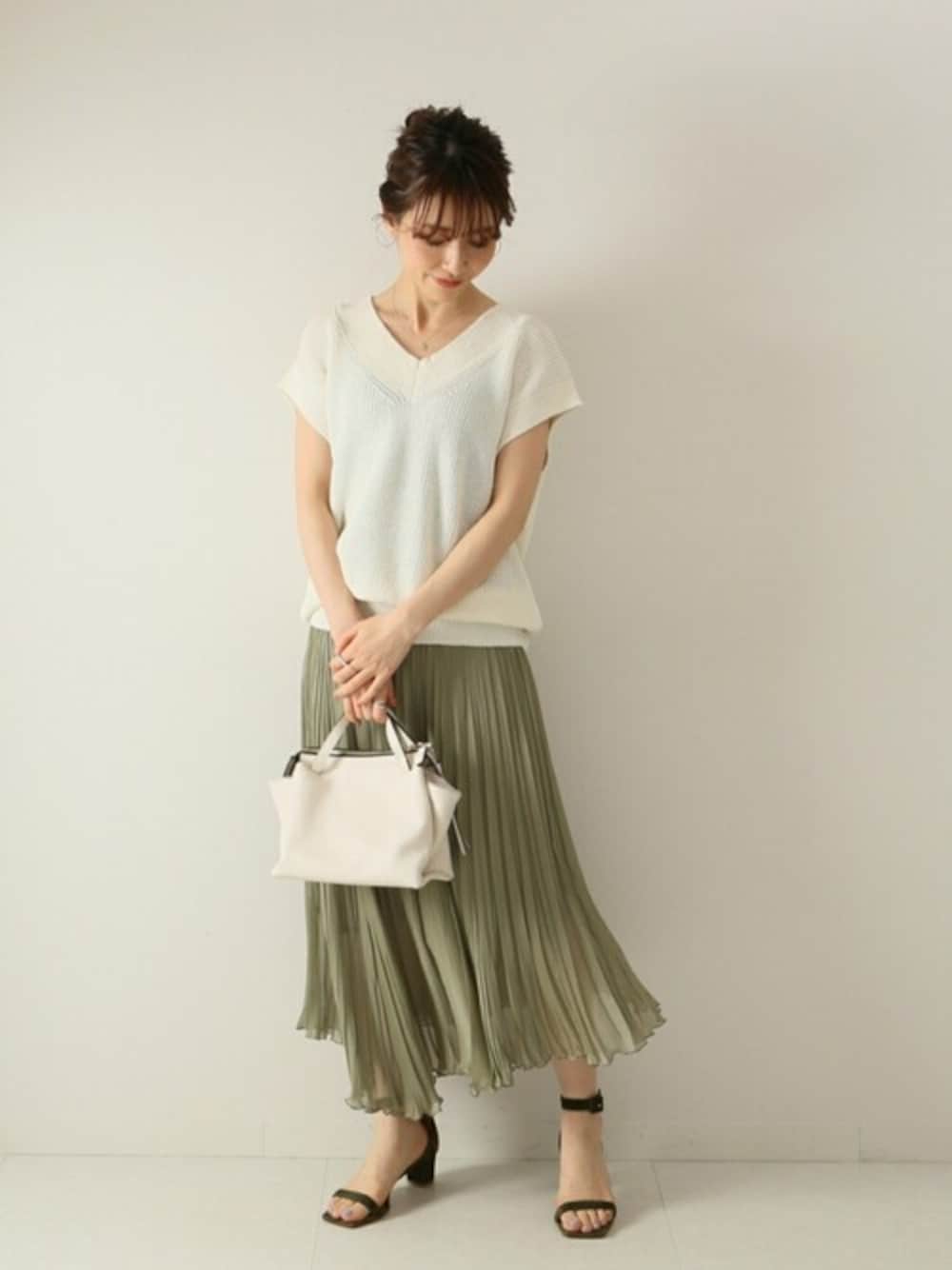 シャリ感のあるニットベストは程よくゆるっとしたサイズ感で夏でも快適。 ニットの質感と、さらっとしたプリーツが好相性のコーディネートです。 裾がアシンメトリーになったプリーツスカートは透け感で軽い印象なので 重たすぎず、夏にぴったり。 軽やかな揺れ感で、女性らしい気持ちも高まるスカートです。
