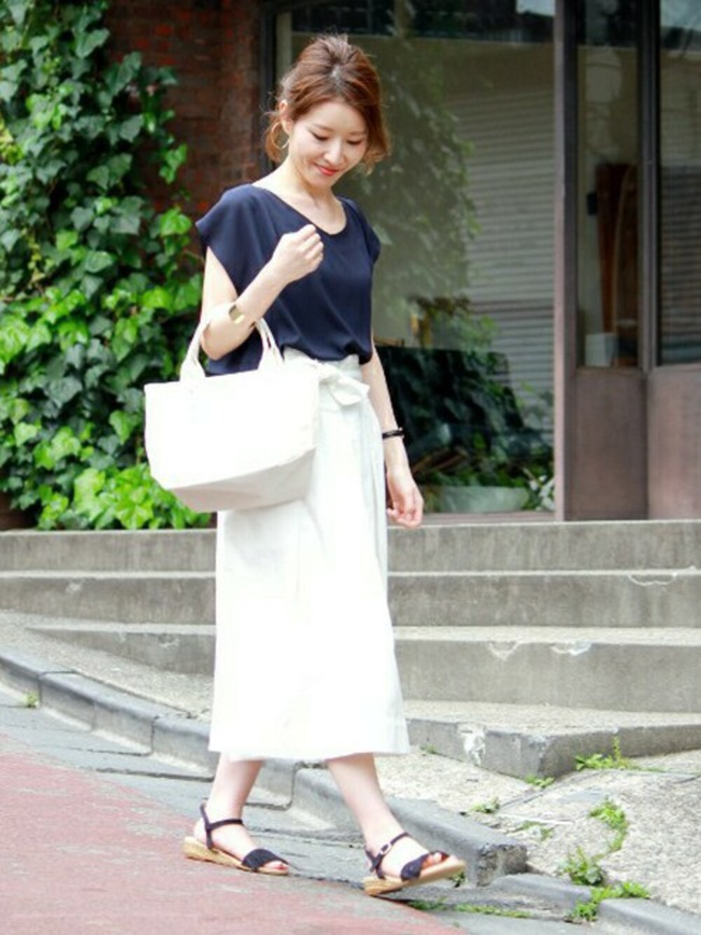 トーンをまとめたおとなカジュアルスタイル! ホワイト×ネイビーのトーンでまとめた大人のカジュアルスタイル。素材感にメリハリをつけて。