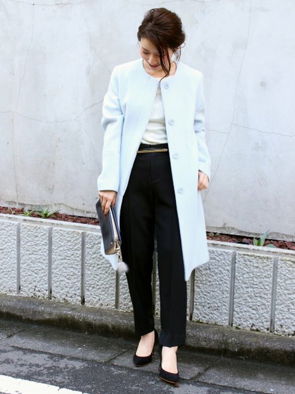 品な雰囲気の漂うオトナのノーカラーコート! モノトーンのハンサムコーデに、ライトブルーのコートを羽織って女性らしさをプラス。