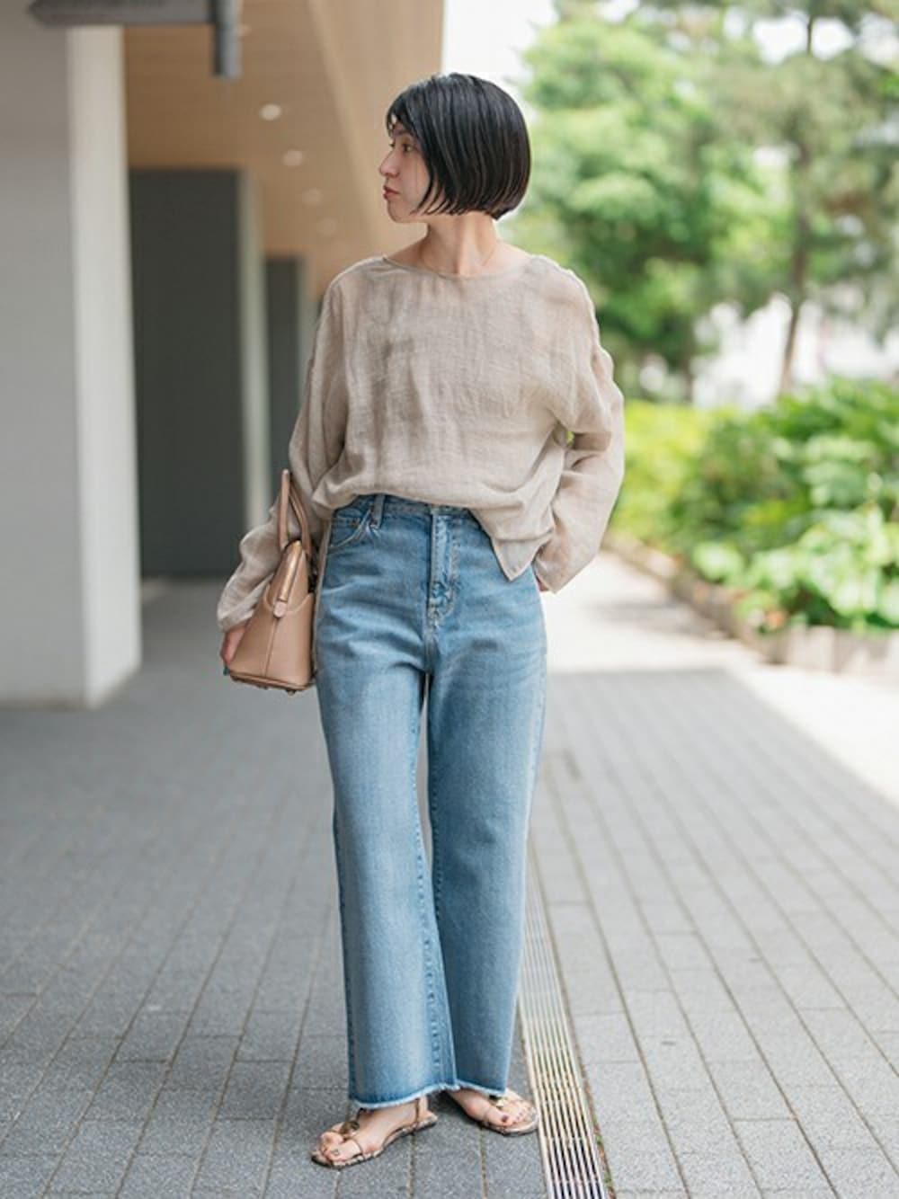涼しげなリネンをメッシュ状にした春夏に大活躍なプルオーバー。 リネンのナチュラルな風合いと程よい透け感が、大人の女性らしさを引き立ててくれる1枚。 身体から離れるオーバーシルエットなので、ジメジメした日もさらっと着られるのが魅力。 クロップド丈のトレンドライクなデニムは、膝あたりからフレアに広がるシルエットで美脚効果も◎ ※着用シューズのサイズについて:着用しているシューズはサンプルの為、モデルが普段着用しているサイズではございません。