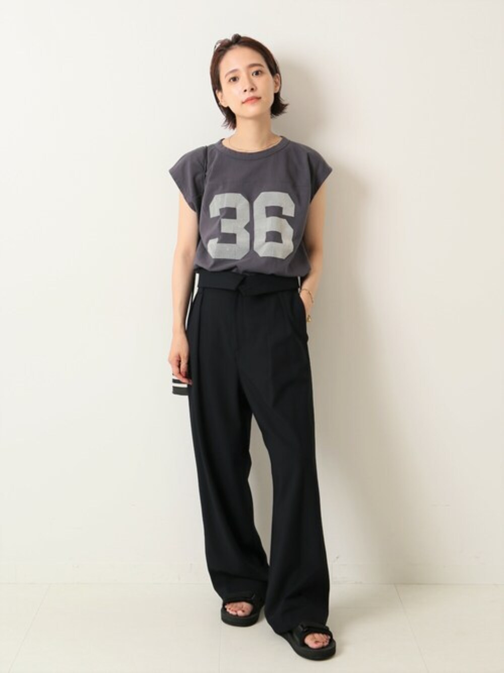 20代後半 / 身長:153cm / ウエーブ / 普段サイズ: 34~36 ハイウエストの美シルエットパンツ。 ウエストのアレンジで雰囲気を変えることができ楽しんでいただけます。 トップスインでウエストラインを見せてのスタイリングがおすすめです。 2タックデザインなので腰回りやヒップにゆとりが出て履き心地も◎ ※着用シューズのサイズについて:着用しているシューズはサンプルの為、モデルが普段着用しているサイズではございません。 =================== ■カットソー 22070200921020 フレンチスリーブフットボールT ¥9,350 入荷:7月予定 ================ *WEB予約・店舗入荷の日程は変更になる事もございます。ご了承下さい。