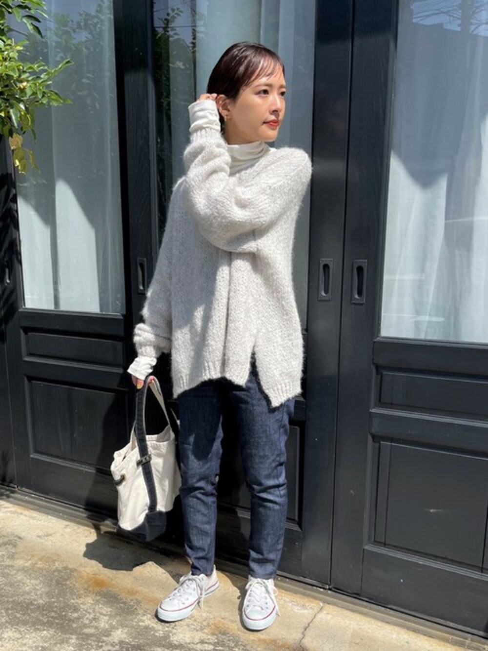 今年もTRICOTS JEAN MARCのニットが登場! ふわふわな質感と丸みのあるシルエットが女性らしいニット。 ボートネックなので1枚で着ると首回りがすっきり。素材感の違うタートルをレイヤードすることでスタイリングに温かみを。 タートルは綿素材で滑らかな肌さわりで快適です。