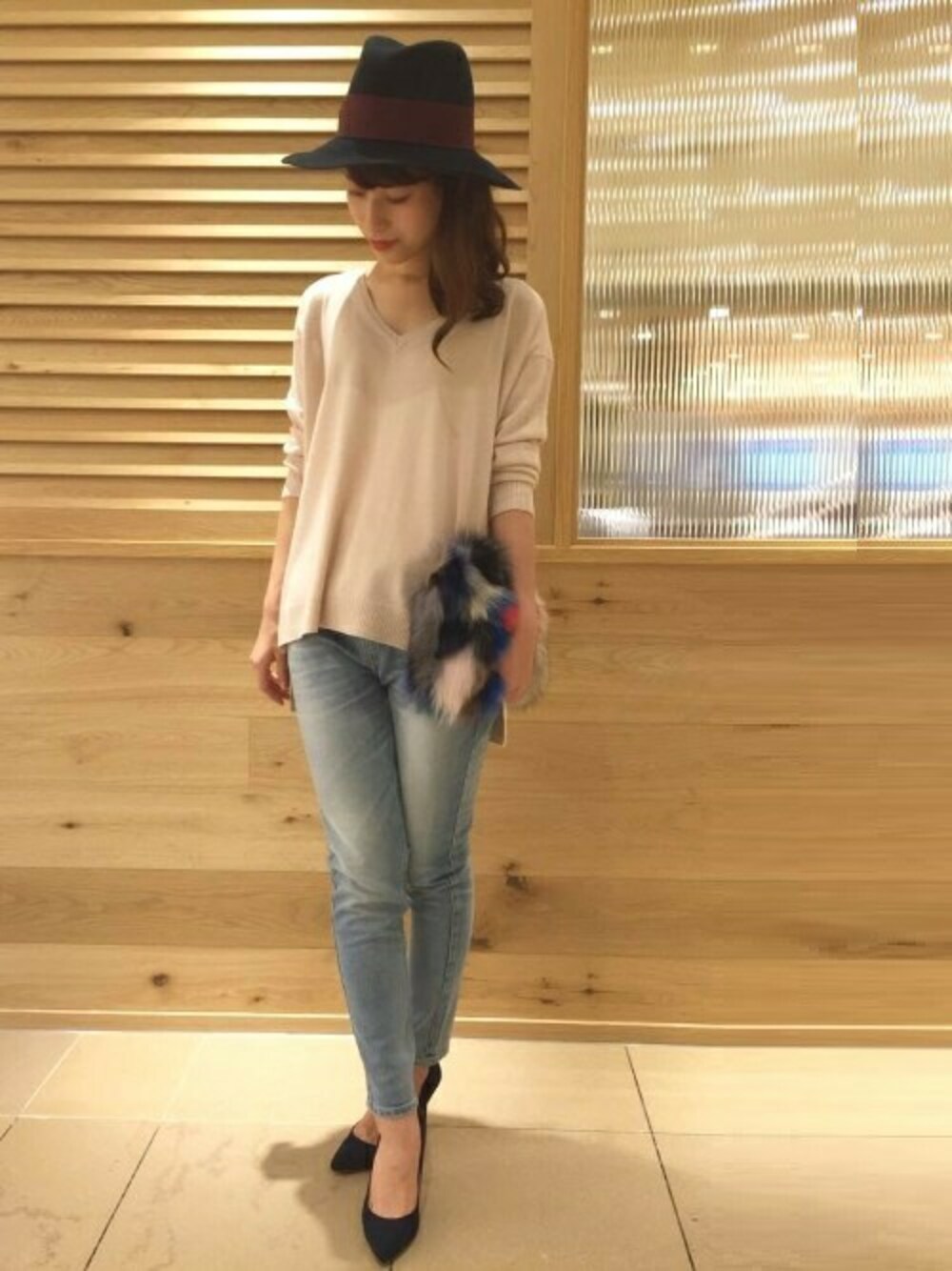 ピンクのニットに、デニムを合わせたカジュアルスタイルに、ヒールを合わせた女性らしいコーディネート。 シンプルなアイテムには、ハットやファークラッチの秋小物でぐっと今年らしさをアップさせて☆