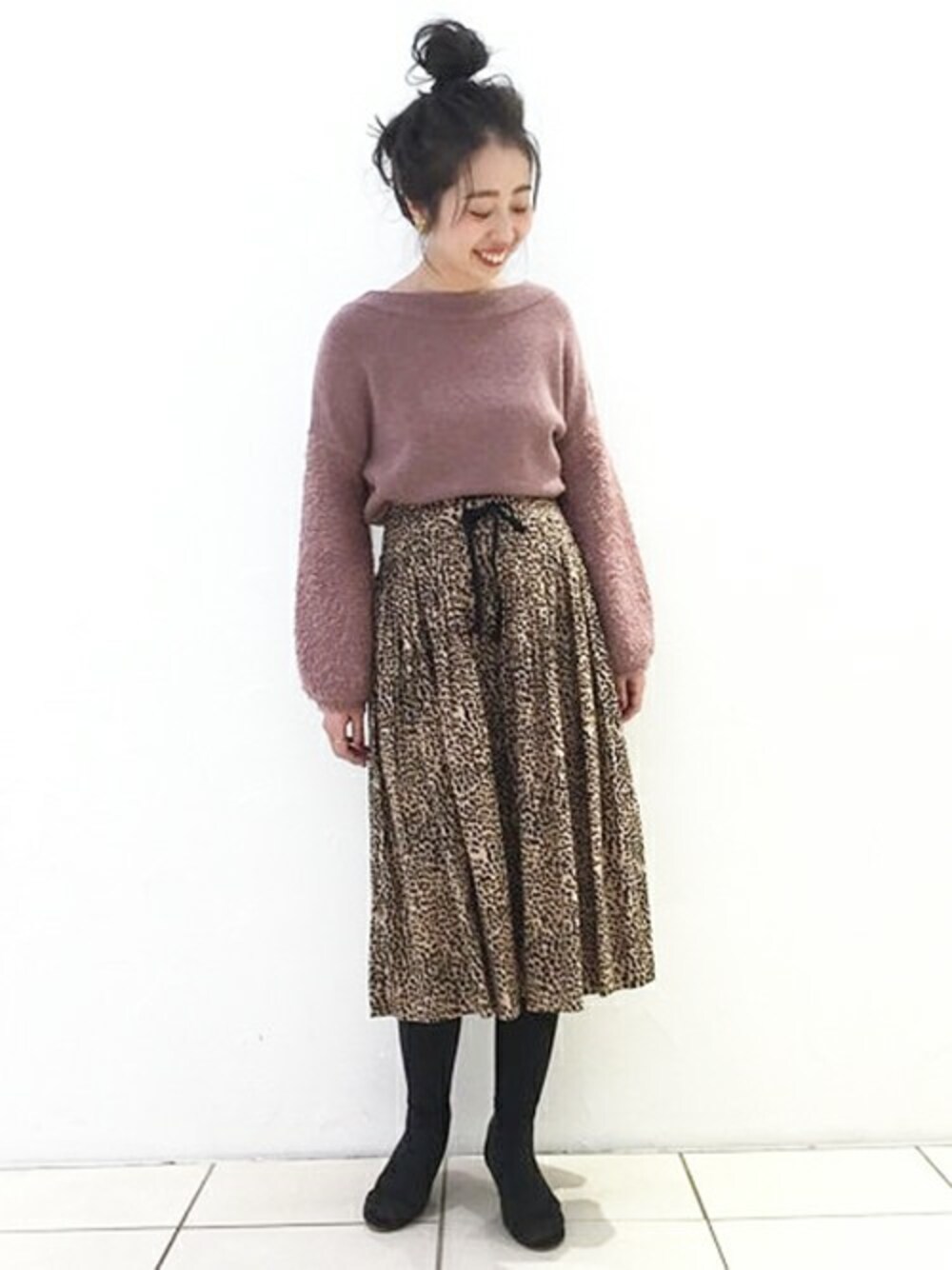ピンクベージュのニットは袖ボリュームが今年っぽい! あえて柄モノで合わせるのもオススメ☆レオパード柄をモノトーンであえて合わせないことで、新鮮な着こなしに。