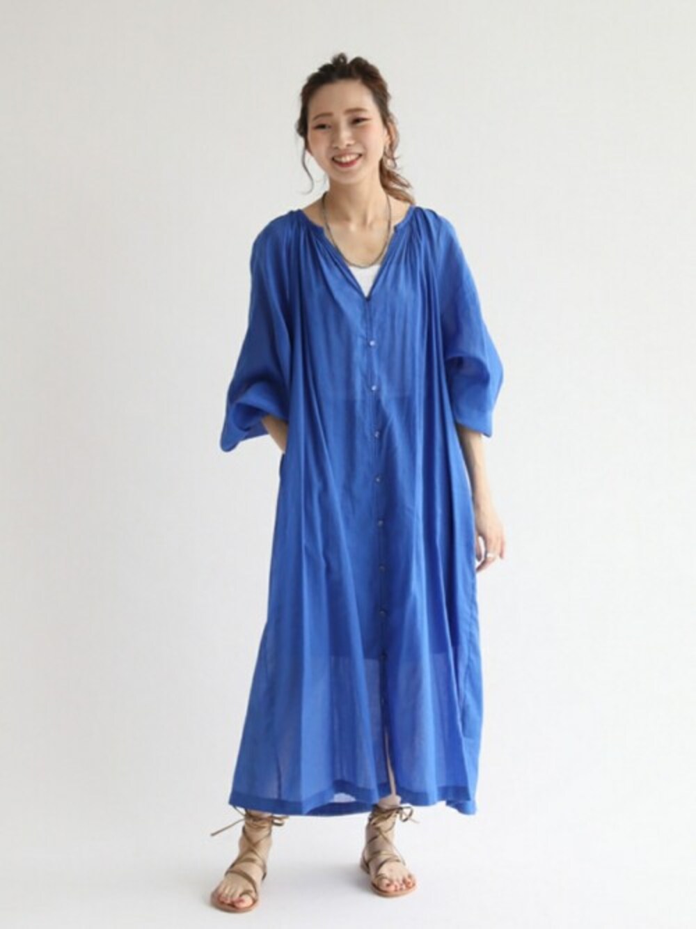 はっと目を惹くような鮮明なブルーが、夏らしい存在感のバックタックオープンドレス。 後ろ姿がポイントで、ちらりと肌見せできるアイテムです。 ボリュームが可愛く、ふんわりとしたシルエットになるように袖はきゅっと上げるのがおすすめです。