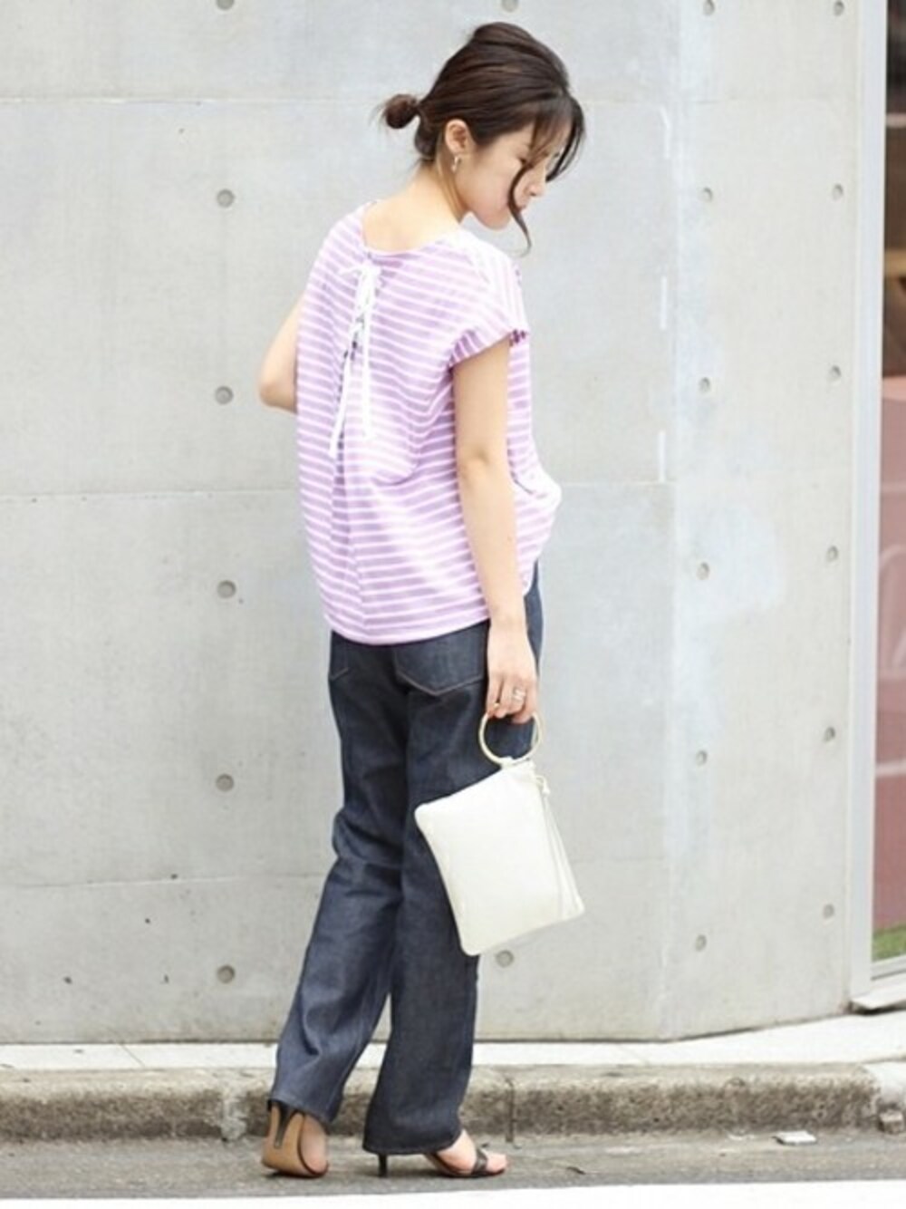 後ろリボンがポイントのカットソーは、インディゴデニムと合わせてカラーを楽しんで。
