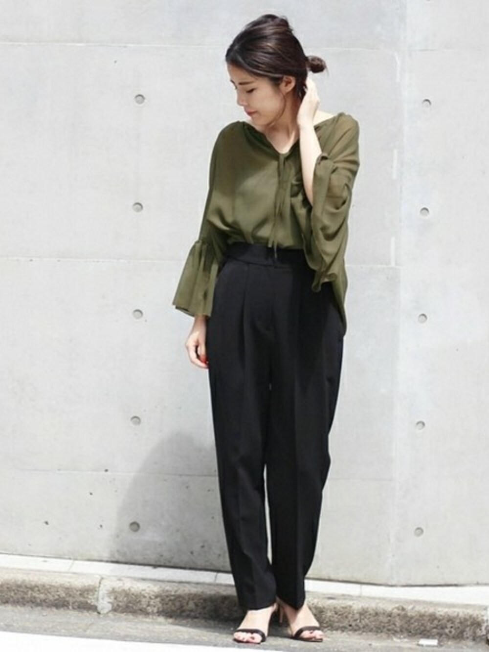 袖コンシャスなフレアスリーブブラウス。ブラックのパンツでシックにまとめて。