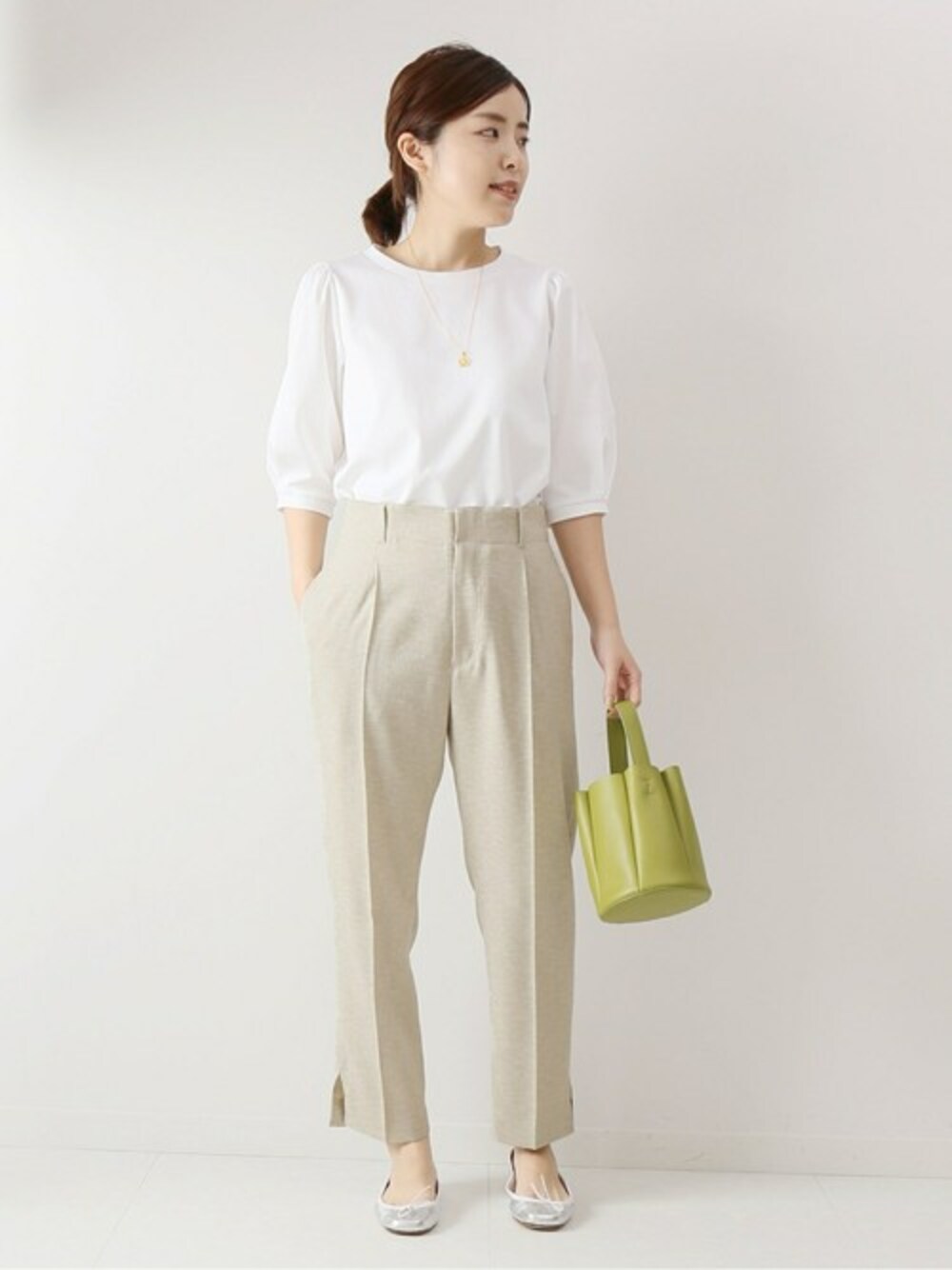 清涼感のある爽やかで涼しげな印象のパンツ。 美シルエットでスタイルアップして見えるのも嬉しいポイント。 リネンのような見た目ですがリネンは入っておらず、お手入れも簡単です◎