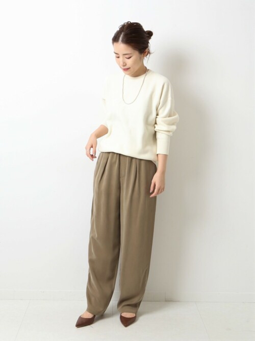 シンプルなコーディネートですが、素材感で変化をプラスしています! ツヤ感と落ち感があるパンツはリラックス感もありながらも、程よくキレイに履けるのが嬉しいポイント。