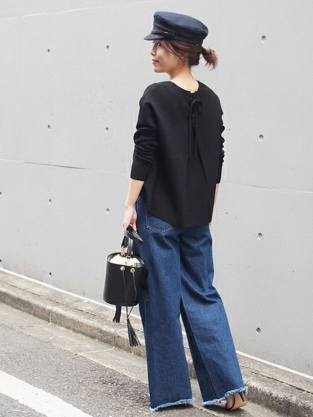 レースアップニット 後ろ姿がポイントのニット。ワイドデニムに合わせたマリンスタイル。