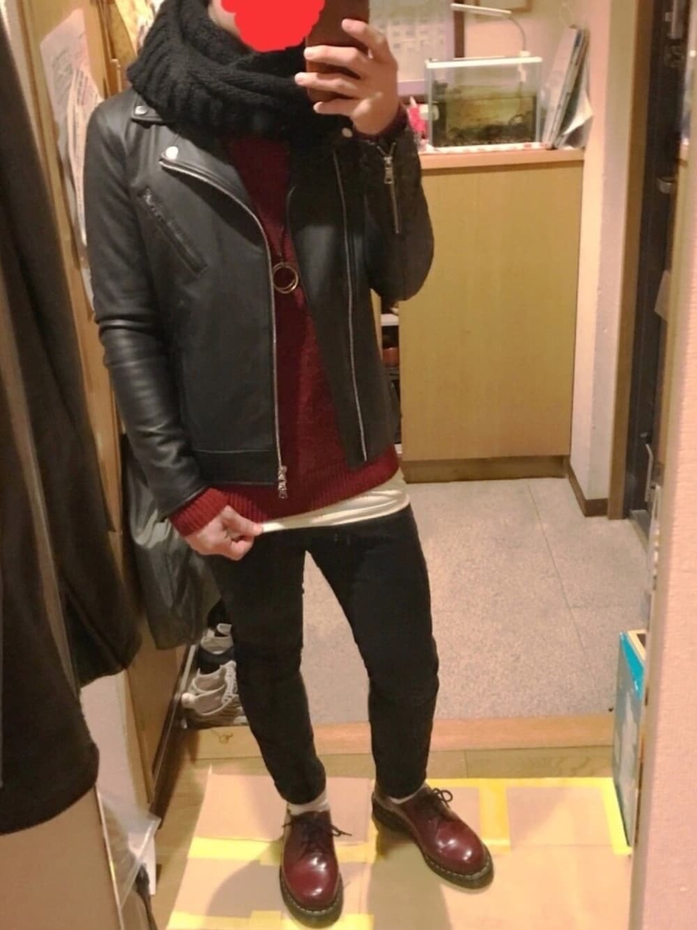 冬でもライダーズが着たい!! という事でニットと合わせました。 首元は黒いスヌードで寒さ対策&雰囲気引き締めで一石二鳥👍 足元は新しく買ったチェリーレッドのDr.Martensを差し色にしてみました! 《サイズ》 アウター xs トップス M パンツ 70cm シューズ 25cm